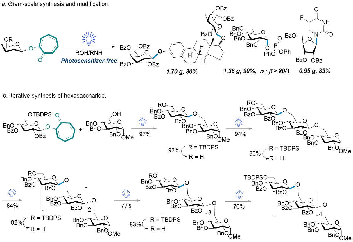 The late-stage glycosylation of natural products or pharmaceuticals on gram scales are also feasible under this method (Figure 3a). The ultimate aim of a glycosylation method is to synthesize glycans. Thus, a hexasaccharide was prepared via iteratively visible-light-promoted glycosylation (Figure 3b).