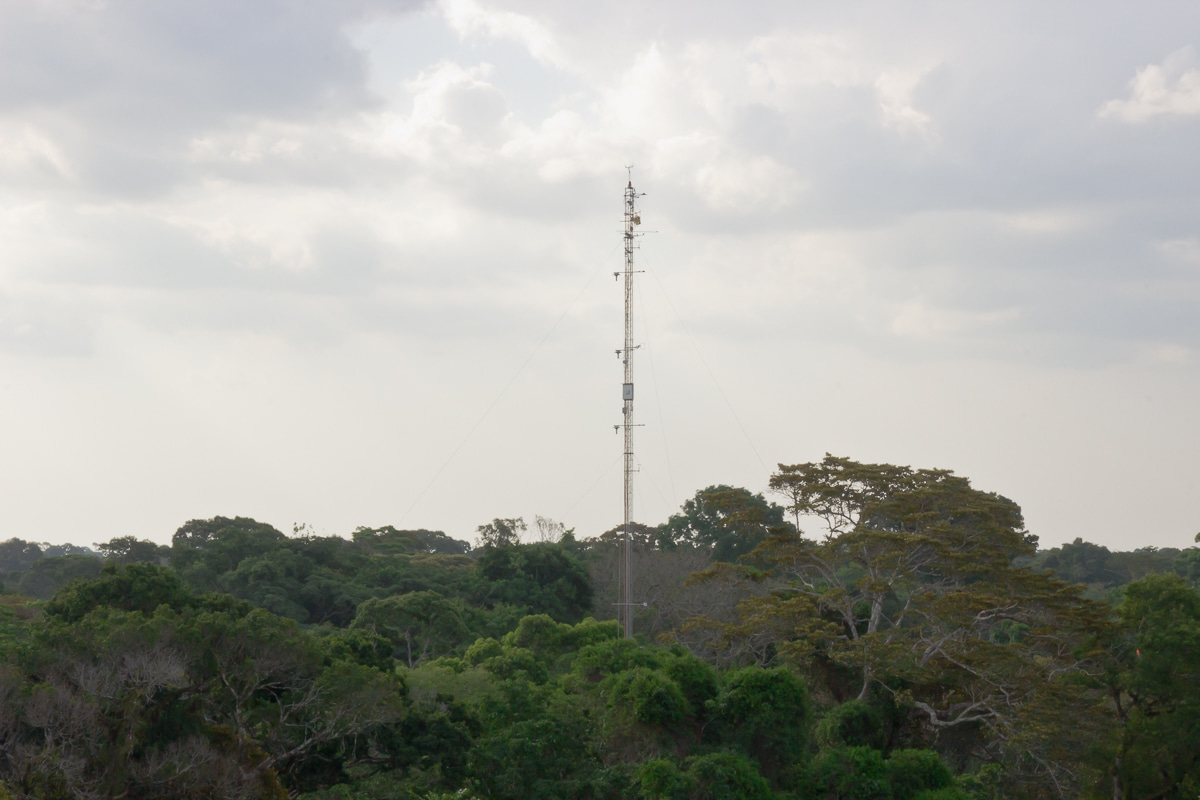 Left: Marielle Smith on top of a canopy walkway at the K67 site in the Tapajós National Forest, one of the natural forest sites used in the study. Right: the 64 m tall eddy flux tower at the K67 site measures fluxes of carbon dioxide between the forest and the atmosphere, used to calculate photosynthesis. Photos by Marielle Smith.