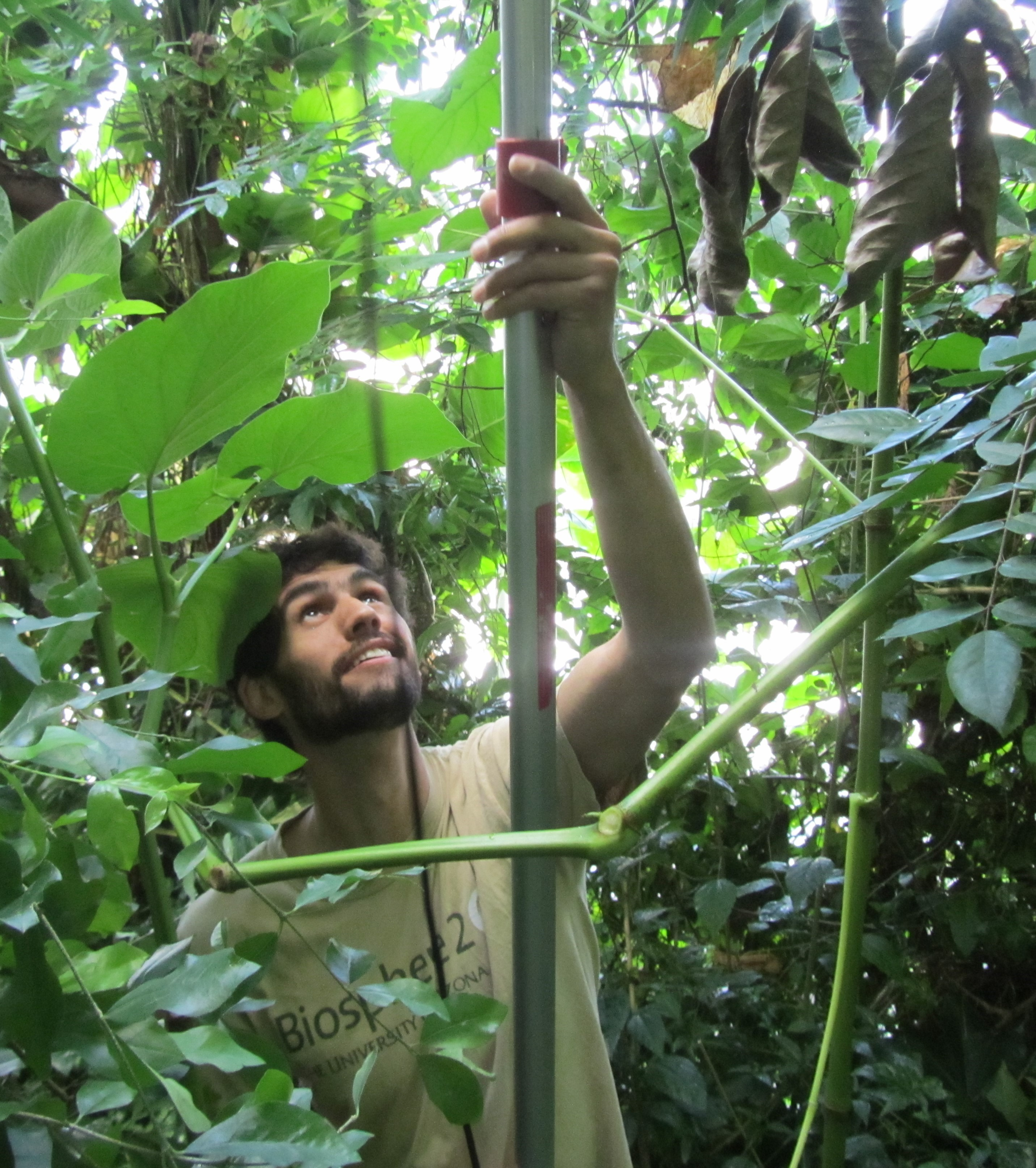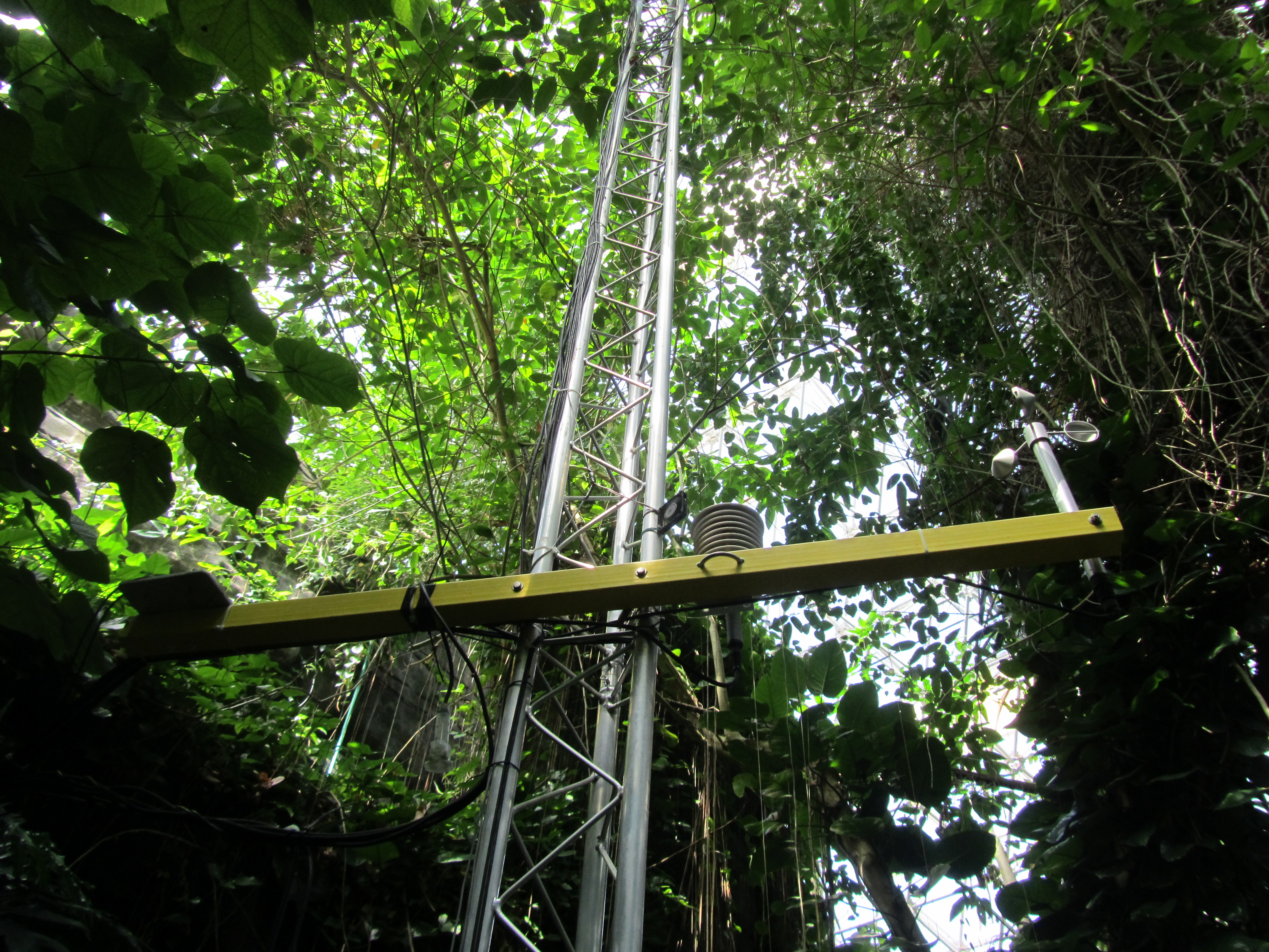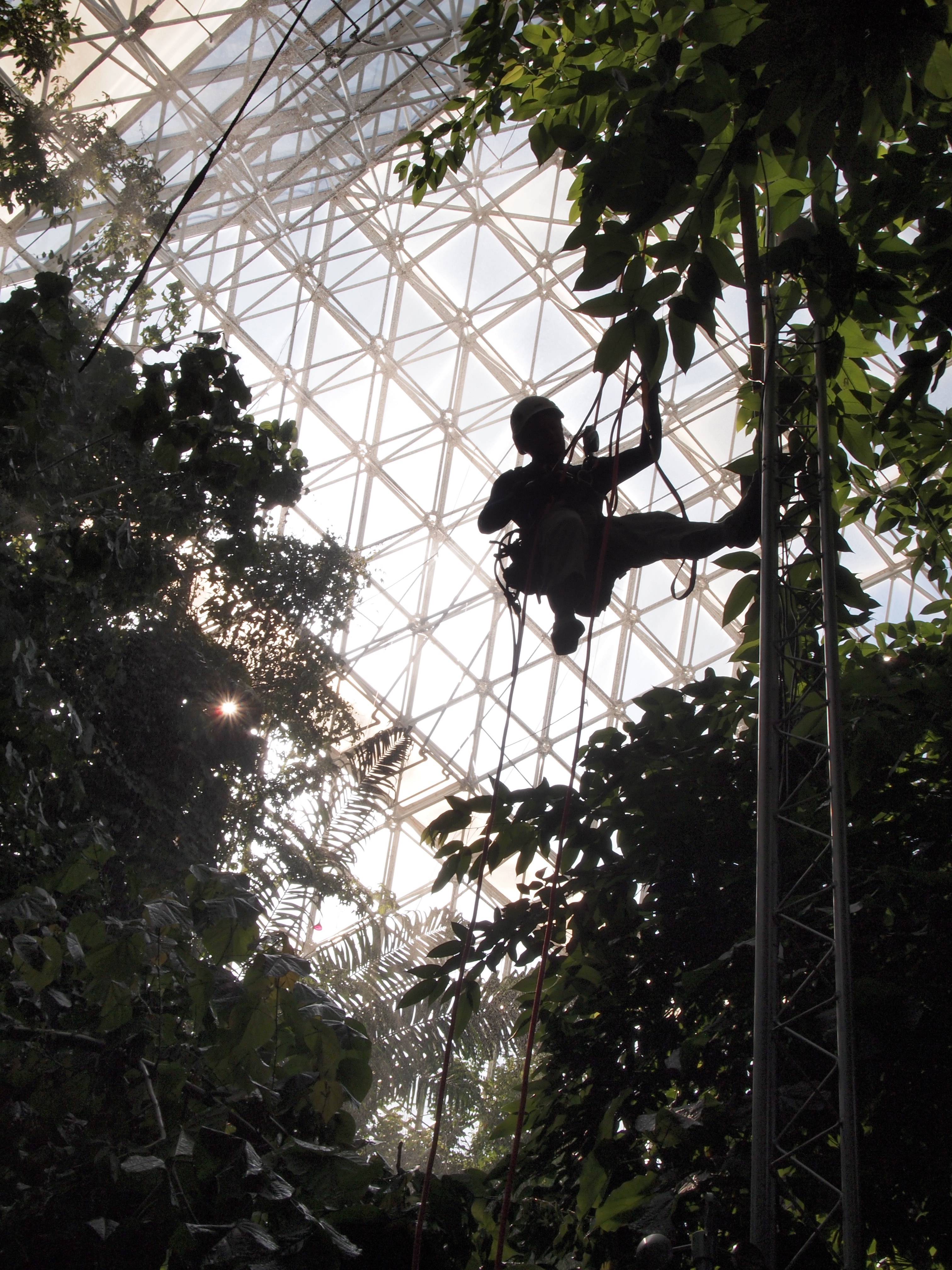 Left: The study's second author, Tyeen Taylor, collects leaf samples inside the B2 tropical forest for a different study of how tropical trees cope with high temperatures. Right: The metal “space frame” that holds up the glass allows access via ropes to any point in the biome, such as to maintain sensors on the observation towers as shown here, or for in situ measurements of tree leaves. Working inside the Biosphere 2 rainforest, encased in a huge greenhouse-like structure, is a truly unique experience. In the words of Neill Prohaska, a PhD student in our group who spent many mornings drenched in the humid tropical air in the middle of a desert, “It’s like being outside, inside”! The slippery mud underfoot and humid aromas emanating from a green wall of vegetation make even a seasoned tropical forest ecologist feel at home. Photos by Tyeen Taylor.