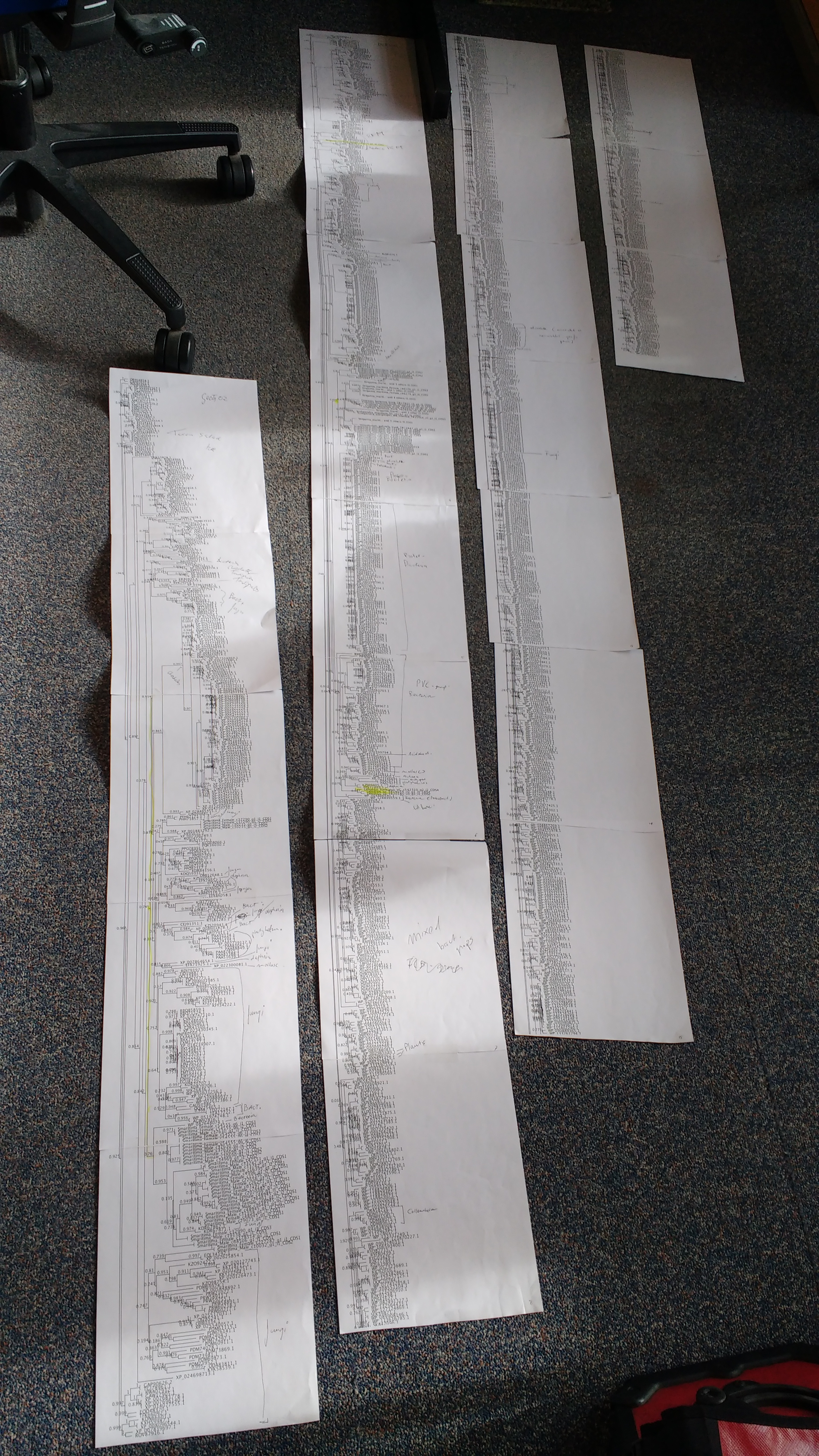 Phylogenetic trees the old-fashioned way: printed on multiple pages and taped together. The left strip of paper shows one tree, the remaining three strips together contain another. Credit: Ronald Jenner