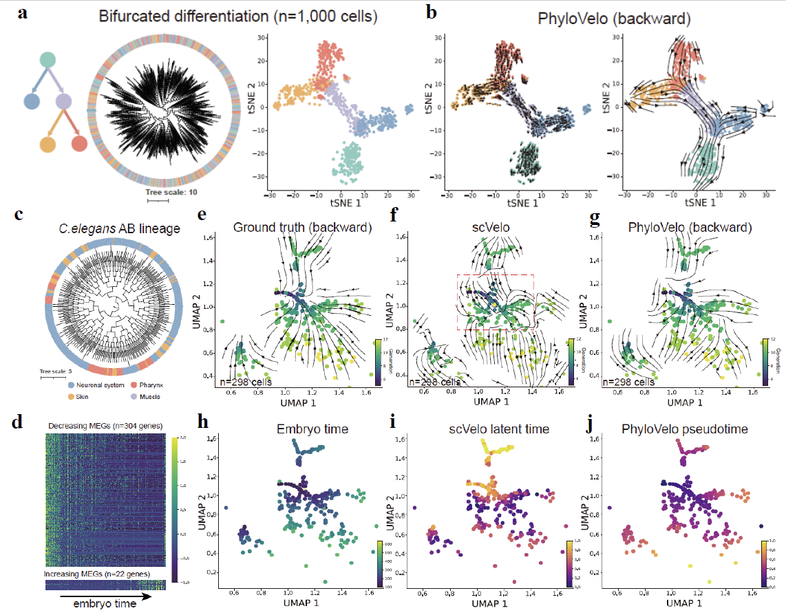 Fig. 2. PhyloVelo recovers complex cell lineages in simulations and C. elegans. (a) Simulation of single-cell RNA-seq data and coupled cell-division history under bifurcated differentiation model. (b) Phylogenetic velocity fields reconstructed by PhyloVelo for the corresponding differentiation scenarios. (c) Phylogenetic tree of the C. elegans AB lineage. (d) Heatmap showing the expressions (z-score normalized) of MEGs along C. elegans embryo time. (e) The ground-truth velocity fields where vectors are superimposed on the cells that point to each of their immediate parental cells on the UMAP plot. (f-g) The velocity fields estimated by scVelo (f) or PhyloVelo (g). Dash square indicates the early embryonic lineages where RNA velocity gave erroneous estimations on the fate directions. (h) C. elegans embryo time as Packer et al., 2019. (i) scVelo latent time. (j) PhyloVelo pseudotime.