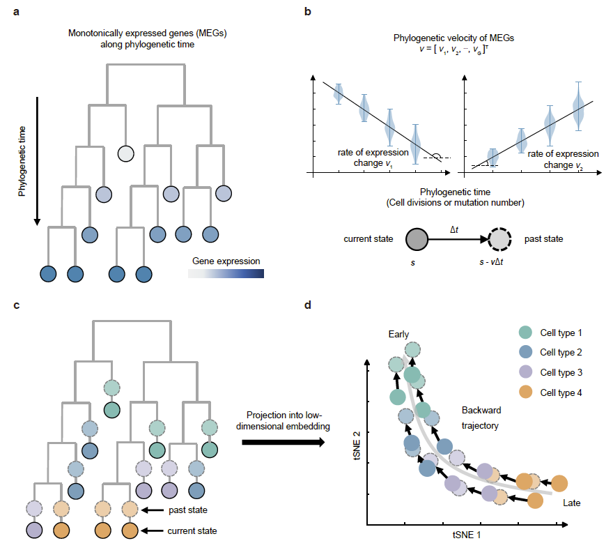 Fig. 1. Schematic of the PhyloVelo framework. (a) Schematic of monotonically expressed genes (MEGs) over phylogenetic time on a cell phylogenetic tree. (b) Two examples of MEGs whose latent expressions are associated with the phylogenetic time. (c) Phylogenetic velocity predicts the past transcriptional state of a cell before a unit of phylogenetic time. (d) Projection of the phylogenetic velocity into low dimensional embedding enables the mapping of cell-state trajectory in backward directions.