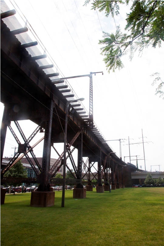 Train trestle above a park outside the University of Pennsylvania’s tech transfer office.
