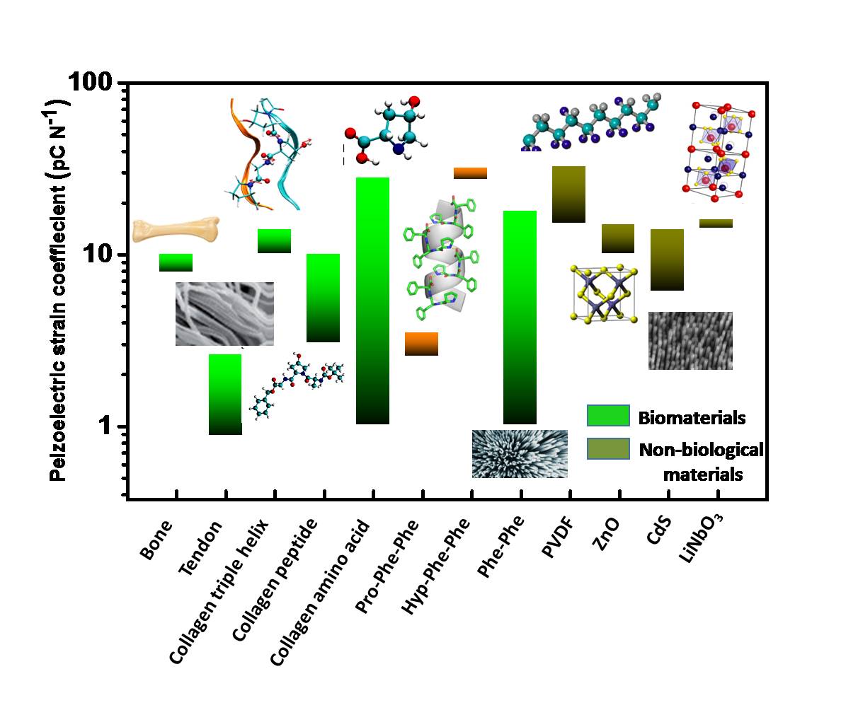 Figure 1. Comparison of piezoelectric strain response of different biological and non-biological materials with Pro-Phe-Phe and Hyp-Phe-Phe.