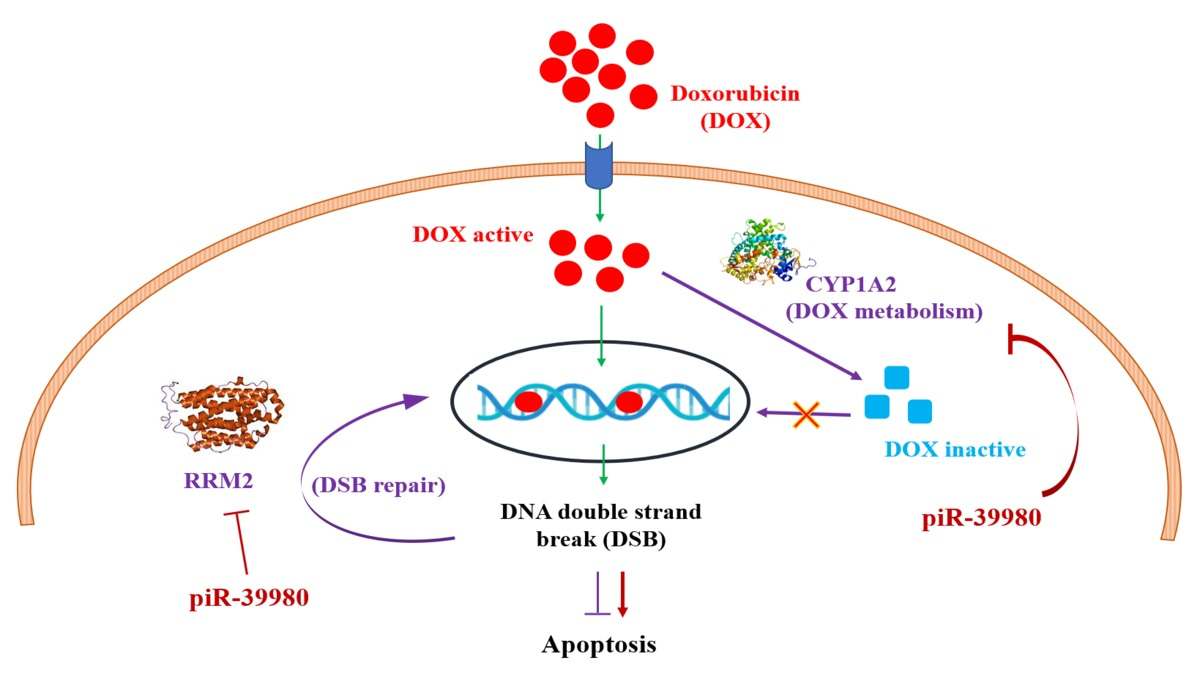 Figure 1. A model showing molecular mechanisms of piRNA inducing sensitivity of DOX. Doxorubicin, an anthracycline antibiotic family of medicine, intercalates into DNA and causes DNA-double strand break (DSB) which leads to cell death. RRM2 rescues DOX-induced DNA damage by activating DSB repair cascade which inhibits cell deaths. Further, the drug-metabolizing enzyme CYP1A2 causes depletion of active DOX within the cells by DOX metabolism. Thus, RRM2 and CYP1A2 induce DOX-resistance in fibrosarcoma cells. piR-39980 represses the expression of both the genes and induces DOX-sensitivity by suppressing DNA repair and DOX-metabolism.