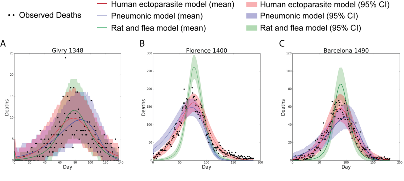 We fit the final models in a Bayesian framework to the historical human mortality records from nine outbreaks during the Second Pandemic. The results were surprisingly clear: in seven out of nine cities, the human ectoparasite model best explained the pattern of observed mortality. In the remaining two, the outbreaks were too small to distinguish between the models. Our results provide quantitative evidence that challenges the assumption that rats spread plague in Europe during the Second Pandemic. We hope that additional studies will investigate the potential of human ectoparasites as plague vectors and their role in past pandemics, and help us re-write history.