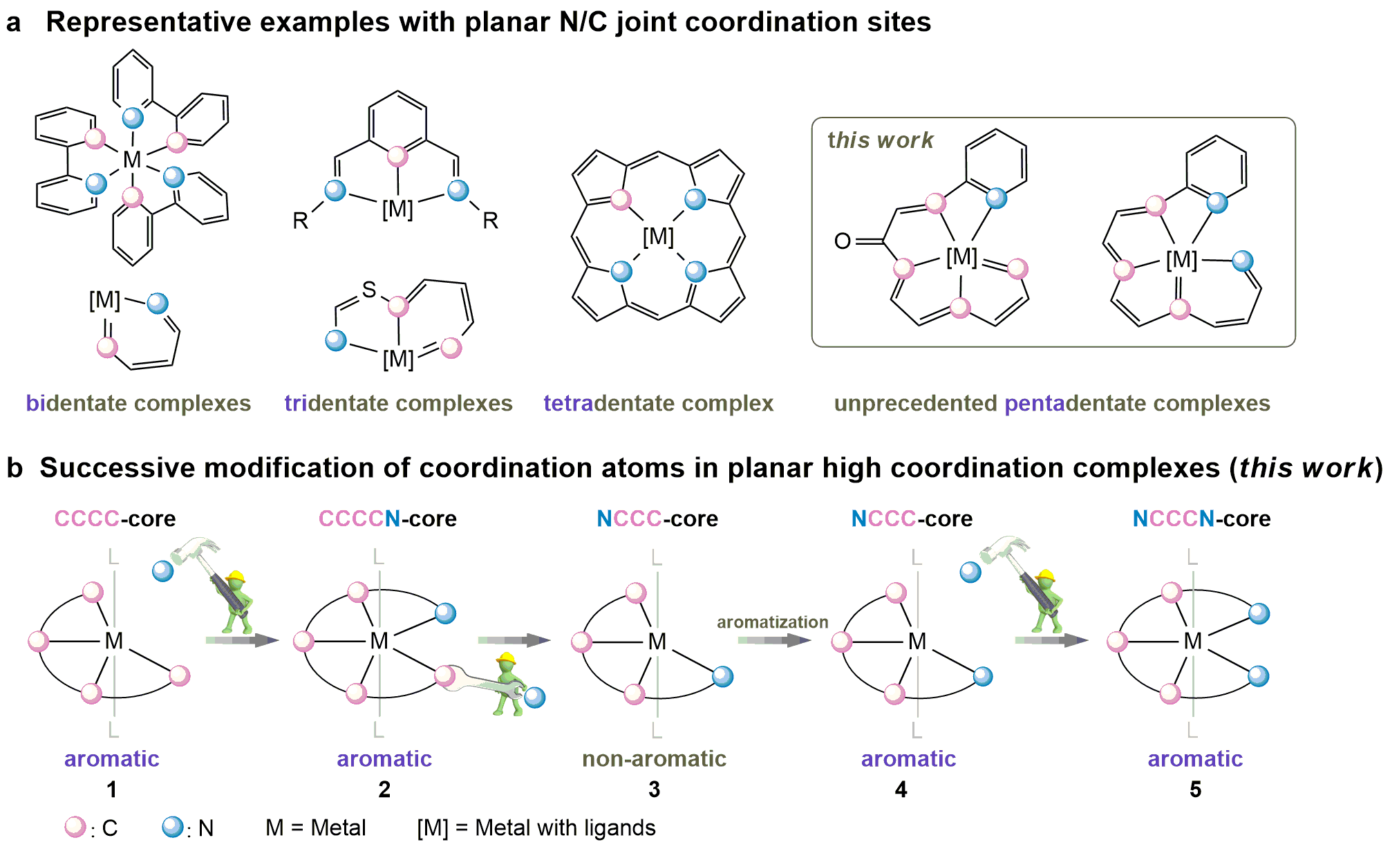 What can we do to achieve the planar N/C high-coordinate complexes? The first thing that came to my mind was our aromatic complexes with a CCC or CCCC core, which exhibit abundant reactivities either to nucleophiles or electrophiles. We begin to dream of the desired NCCCC pentadentate complex to be obtained by “imbedding one nitrogen atom” to the CCCC core. We were happy to find that metal carbene character and the the strained three-membered metallacyclopropene unit in CCCC complex have done a great favour for the successive and direct transformation of coordinating atoms in complexes. The starting CCCC complex were then converted to the corresponding CCCCN, NCCC, and NCCCN compounds, which could be isolated efficiently under mild condition. Our experimental observations, together with theoretical calculations, reveal the inherent aromatic nature of the complexes with N/C high coordination environment.