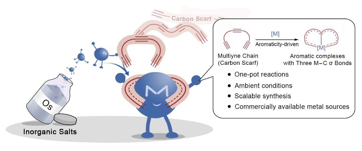 Carbon is one of the most fundamental elements in chemistry. The combination of carbon with metal leads to the development of organometallic chemistry, which vastly accelerates the development of chemistry, biology, and material science. In general, the approach to organometallic complexes should be carried out under inert atmosphere using standard Schlenk techniques or even in gloveboxes. Among the large class of organometallic complexes, there are many attractive metallacycles with unique properties, organometallic reactivity, and aromaticity, which have been regarded as metallaaromatics that greatly expanded the library of known aromatics. The origin of metallaaromatics can be traced back almost 40 years to the first computationally proposed metallabenzene complexes by Thorn and Hoffman15 in 1979 (Nouv. J. Chim. 3, 39-45, 1979), which was synthesised and characterised three years later (J. Chem. Soc., Chem. Commun. 14, 811-813, 1982). I have been fascinated by these distinct organometallic complexes on my doctorate research, and I was lucky enough to discover the first free metallabenzenes with a metal atom from the second transition series, i.e. ruthenabenzenes, just before my graduation (Angew. Chem., Int. Ed. 45, 2920–2923, 2006). Since that time, our interest in these aromatic organometallic complexes continues to this day. A diverse array of monocyclic and polycyclic metallaaromatics has been achieved in our group through the reactions of simple transition metal complexes and substituted alkynes (Wright, L. J. Metallabenzenes: An Expert View (Wiley, Oxford, 2017)).
