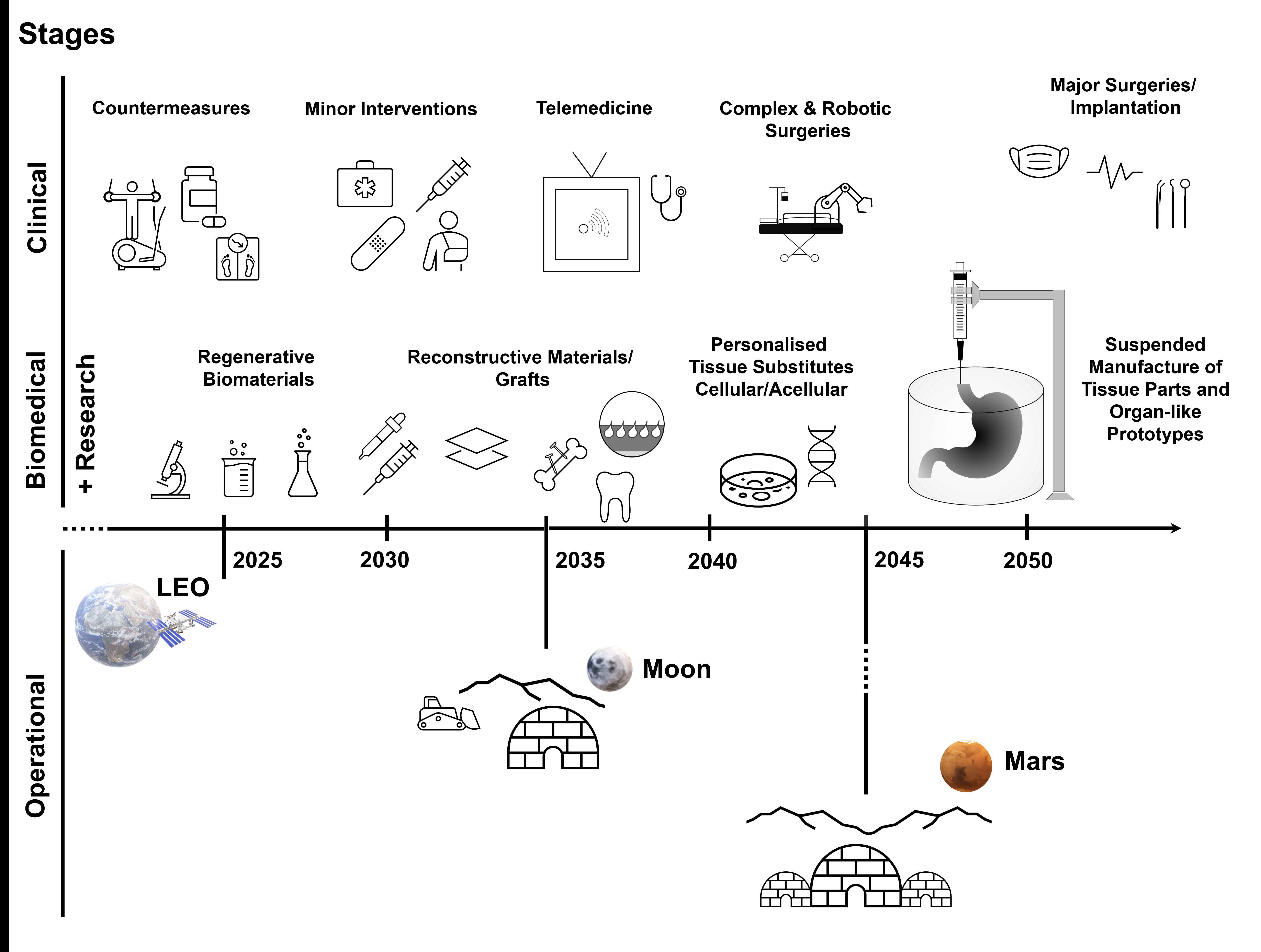 Figure 1. A timeline of the required (bio)medical activities within planetary habitats during the next decades.