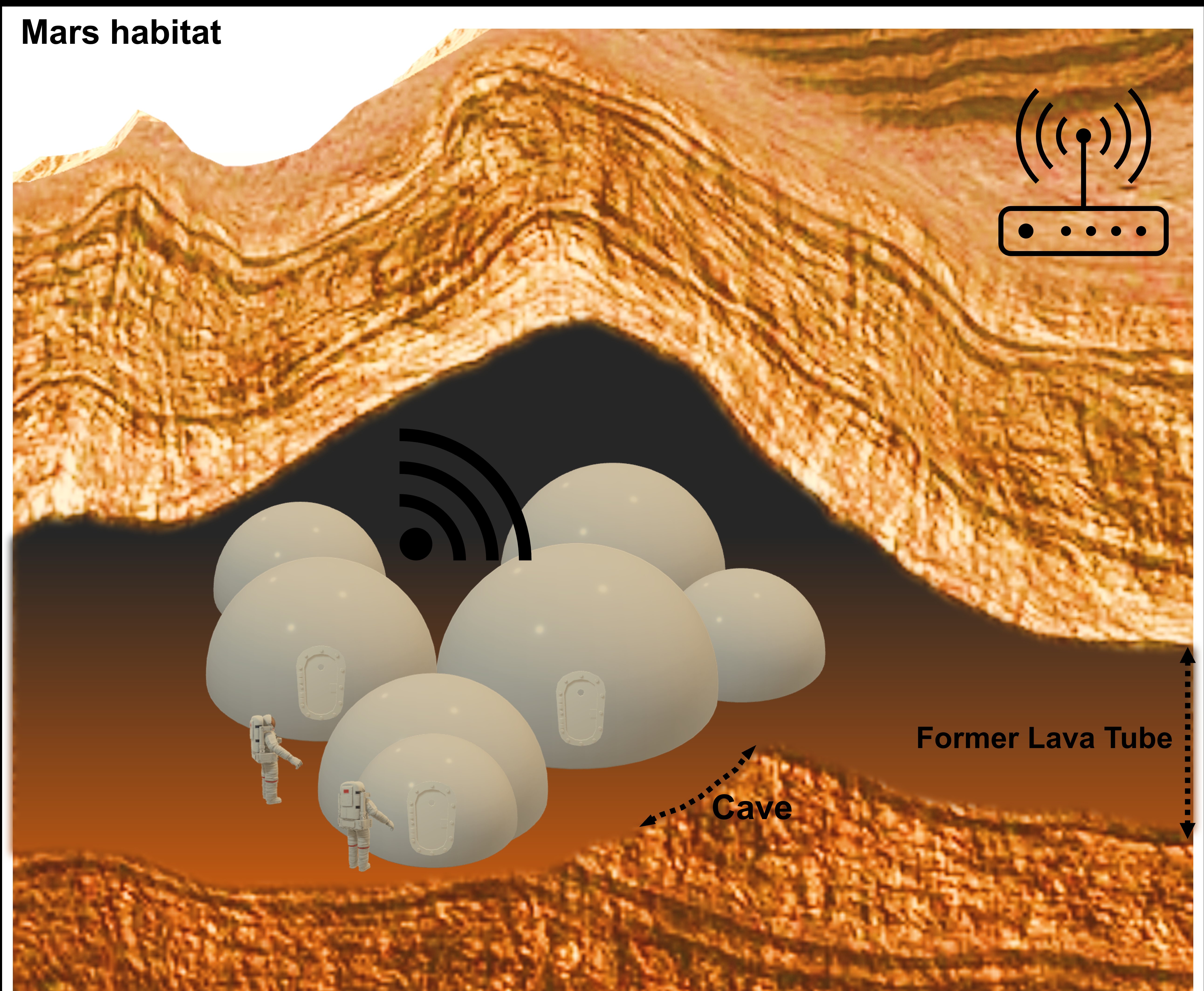 From an operational perspective, one of the main challenges with the construction of such a critical habitat at a planetary surface is the exposure to significant cosmic radiation, as well as falling micro-meteorites and larger objects, which can significantly damage key structures. As such, additional geological environments may be a likely option for shielding, such as the lunar caverns or extensive Martian underground pyroducts. Mars, for example, contains many extensive caves and lava tubes that formed following previous volcanic activity (Figure 3). These structures are larger than the Earth counterparts and in the case of lunar caverns, these are believed to have more hospitable temperatures.