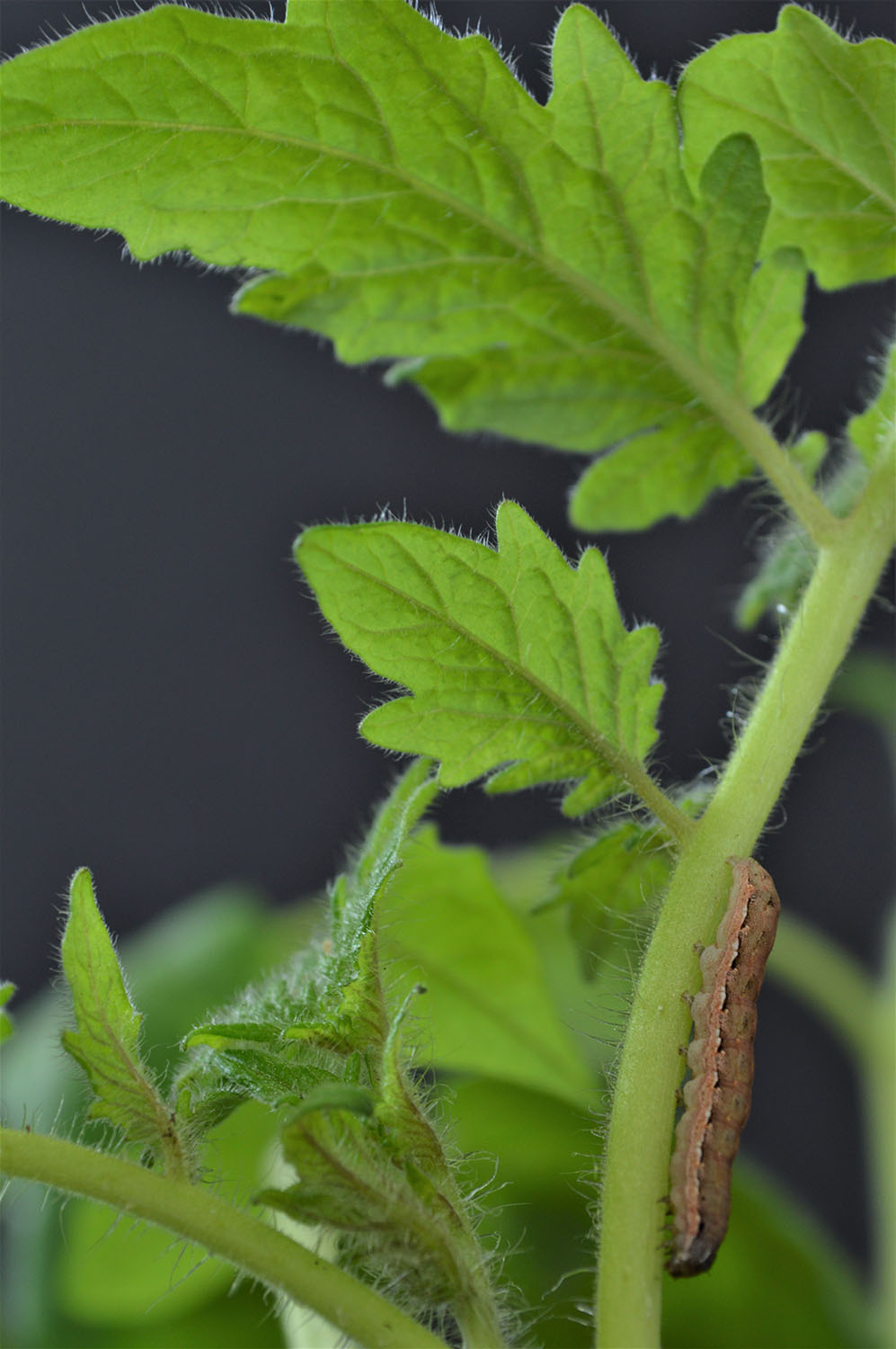 Photo caption: A beet armyworm (Spodoptera exigua) on a tomato plant (photo credit: Dr. Brian Connolly)
