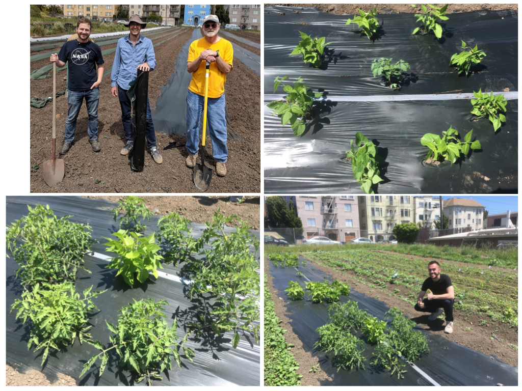 Experimental plant neighborhoods shed light on plant microbiome formation. Top-left: T. Caro, yours truly (K. Meyer), and S. Lindow getting ready to begin planting the experiment’s 72 neighborhoods (504 plants). Not pictured are C. Hernandez, R. Debray, X. Zhang, E. Mehlferber, and B. Koskella who also helped with planting. Top-right: a tomato focal plant surrounded by a bean neighborhood, just after initial planting. Bottom-left: A bean focal plant in a tomato neighborhood after one month in the field. Bottom-right: co-author R. Porch getting ready to measure attributes of the neighborhoods before our first harvest.