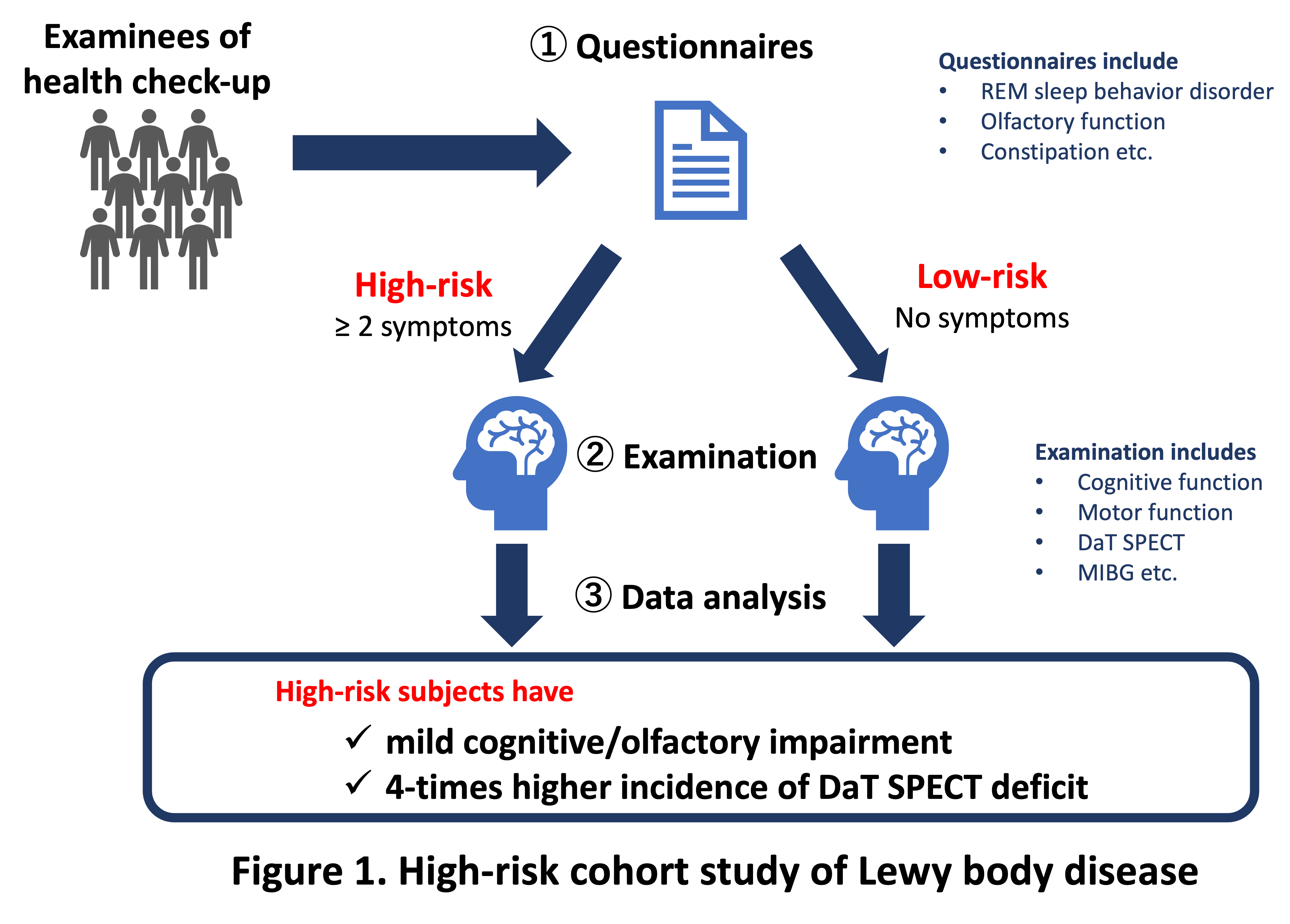 Our previous research identified that 5.7% of healthy individuals over 50 years old have two or more prodromal symptoms, defining them as high-risk subjects for developing Lewy body disease (Hattori et al. J Neurol 267(5):1516-1526, 2020). High-risk individuals had mild cognitive decline and hyposmia compared with low-risk individuals with no prodromal symptoms. Approximately one-third of the high-risk individuals had deficits in DaT-SPECT or cardiac MIBG scintigraphy, and the prevalence of abnormalities on DaT-SPECT was 4 times higher in the high-risk individuals than that in the low-risk individuals (Hattori et al. NPJ Parkinsons Dis 9:1-9, 2023) (Figure 1).