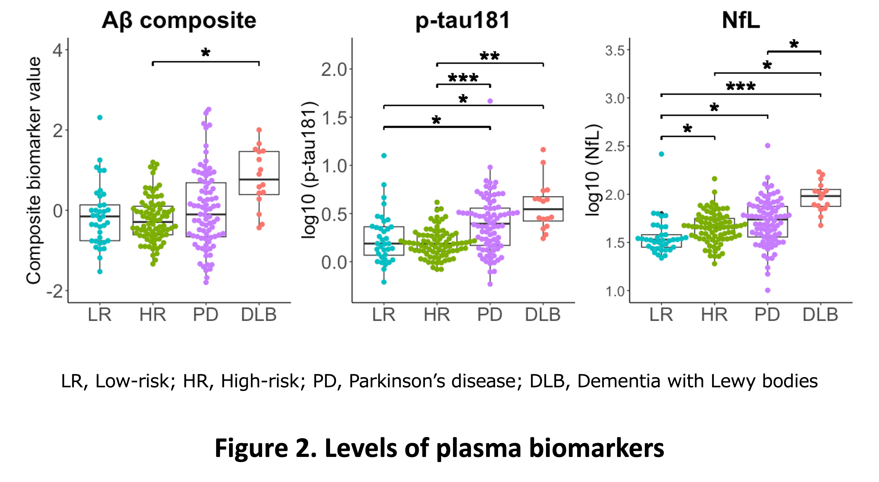 The study found that patients with Parkinson’s disease with cognitive impairment and patients with dementia with Lewy bodies had elevated levels of Alzheimer’s disease-related biomarkers (Aβ composite and p-tau181) compared to low-risk individuals. However, high-risk individuals did not show an increase in these biomarkers. The neurodegeneration marker neurofilament light chain (NfL) was elevated in patients with Parkinson’s disease and dementia with Lewy bodies and high-risk individuals compared to low-risk individuals (Figure 2).