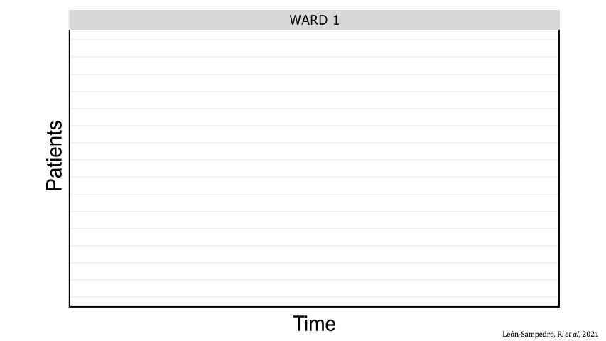 Between-patient transfer of plasmid-carrying enterobacteria in the hospital. Each row represents an individual patient admitted to the ward and the arrows represent transmission events.
