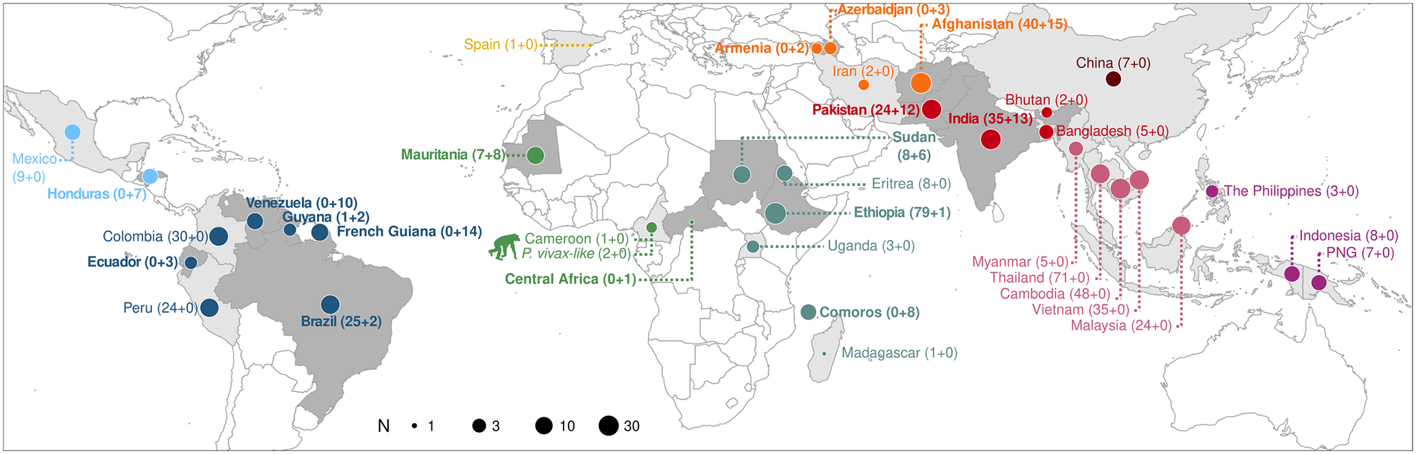 The researchers compiled a non-redundant dataset of 620 P. vivax genomes across 36 countries worldwide, representing the nearly all sequenced and available P. vivax isolates to date. This dataset included 107 newly sequenced samples from six Central and Southern American countries (Brazil, Ecuador, French Guiana, Guyana, Honduras, and Venezuela), five African countries (Central Africa, Comoros, Ethiopia, Mauritania, and Sudan), three Middle Eastern countries, two South Asian countries, and one Oceanian country. The dataset also incorporated the historical "Ebro" sample from 1940s Spain and two P. vivax-like genomes from Cameroonian chimpanzees as outgroups.