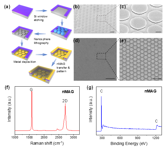 To surmount the limitations posed by the monolayer graphene absorption and attain the practical benefits of graphene-based photodetectors, a new approach is presented in this study for constructing highly sensitive dual-band photodetectors. This approach integrates the localized electric field generated from metallic plasmonic nanostructure with the unique absorption characteristic and strong PTI effect of nMAG. Plasmonic nanostructures composed of metal on the top and bottom surfaces of silicon cylinders can enhance optical detection and photoresponse at specific plasmon resonance frequencies, thereby enabling sensitive responses from a dual-band of 1342 nm and 1850 nm in nMAG-Au-Si photodetectors. Photoresponse studies show that integrating the plasmonic nanostructure can significantly improve photocurrent up to 5800%, achieving a responsivity of 52.9 mA/W and a detectivity of 4.77 × 1010 Jones. Implementing this dual-band detector provides a new approach to surpass the performance limitations of traditional silicon-based infrared photodetectors.