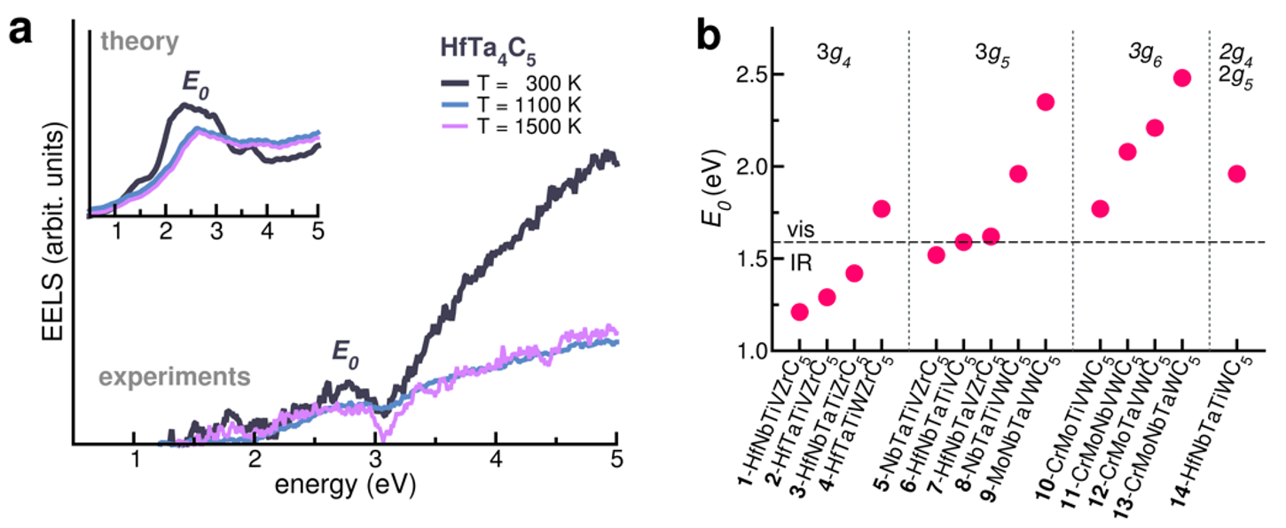 We started the investigation on carbides by considering the optical properties of the archetype HfTa4C5, which is a well-established compound with exceptional thermal and mechanical properties. Simulations predicted a plasmonic resonance in the visible range which remains extremely stable even at ultra-high temperature, making it the first instance of a multifunctional disordered carbide. Direct STEM/EELS measurements on HfTa4C5 confirmed the theoretical results over a wide temperature range T=300-1500K (Figure 1, panel a), well above the melting point of noble metals.