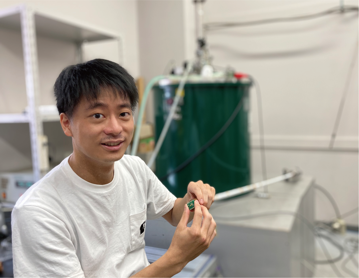 Figure 2 First author, Naotaka Kasuya, measuring the temperature dependence of resistance of an organic two-dimensional hole gas.