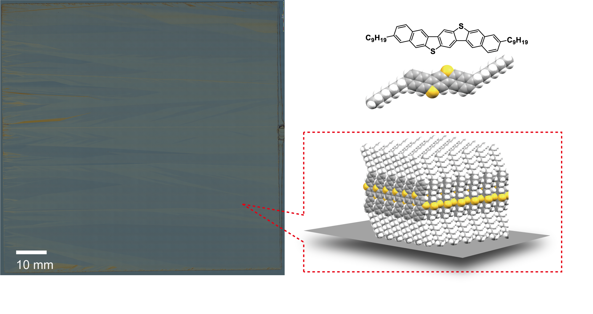 Figure 1. Confocal microscopy image of 10 cm by 10 cm C9–DNBDT crystal on silicon wafer. Molecular structure and assembly of C9–DNBDT.