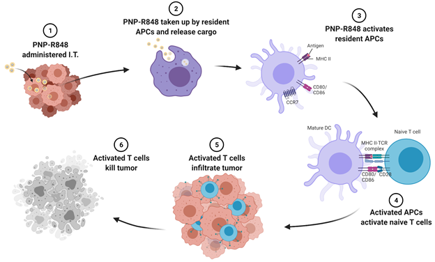 The nanoparticles are able to generate a superior antitumor immune effect compared to either free drug or PEGylated nanoparticles likely due to their enhanced retention at the tumor site. Upon injection, the PNP-R848 remains at the tumor site, where it is taken up by resident antigen presenting cells (APCs). Once taken up, the PNP-R848 releases its cargo, which activates the APCs. The activated APCs then migrate to the nearest lymph node, where they train other immune cells, called T cells, to recognize and fight the cancer. Some T cells return to the tumor site to battle the tumor, while others circulate and surveil in the body to eliminate any tumor cells that escaped from the original tumor site.