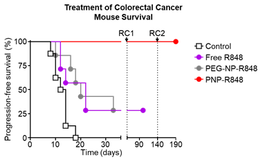 In the colorectal cancer model, PNP-R848 not only entirely eradicated the tumor, but it also induced a sustained long term immunity. Mice that had been treated initially with PNP-R848 were rechallenged not once, but twice, with increasing tumor burdens. The mice were able to completely reject and kill these tumors without any additional PNP-R848 treatments, suggesting that treatment with PNP-R848 has the potential to prevent future recurrence of the cancer.