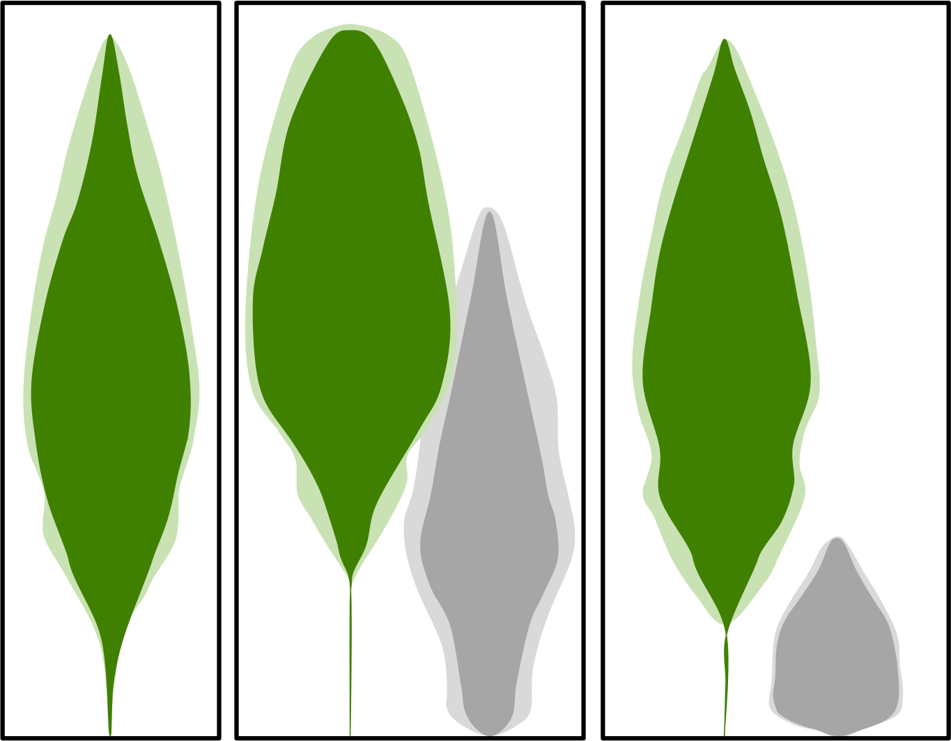 Initial outlines of paper birch saplings (in green) showed they had a different shape depending on whether they were growing in monoculture (left), with red oak (middle) or white pine (right).