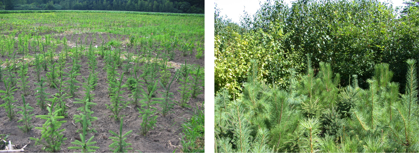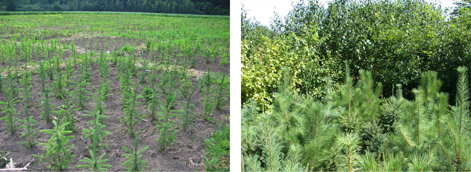 Tree seedlings were planted close together in the experiment to mimic their density in regenerating forests and promote early interactions among them (left). By the end of their third growing season, seedlings had grown to form closed-canopy stands (right). Photos: Alain Paquette.