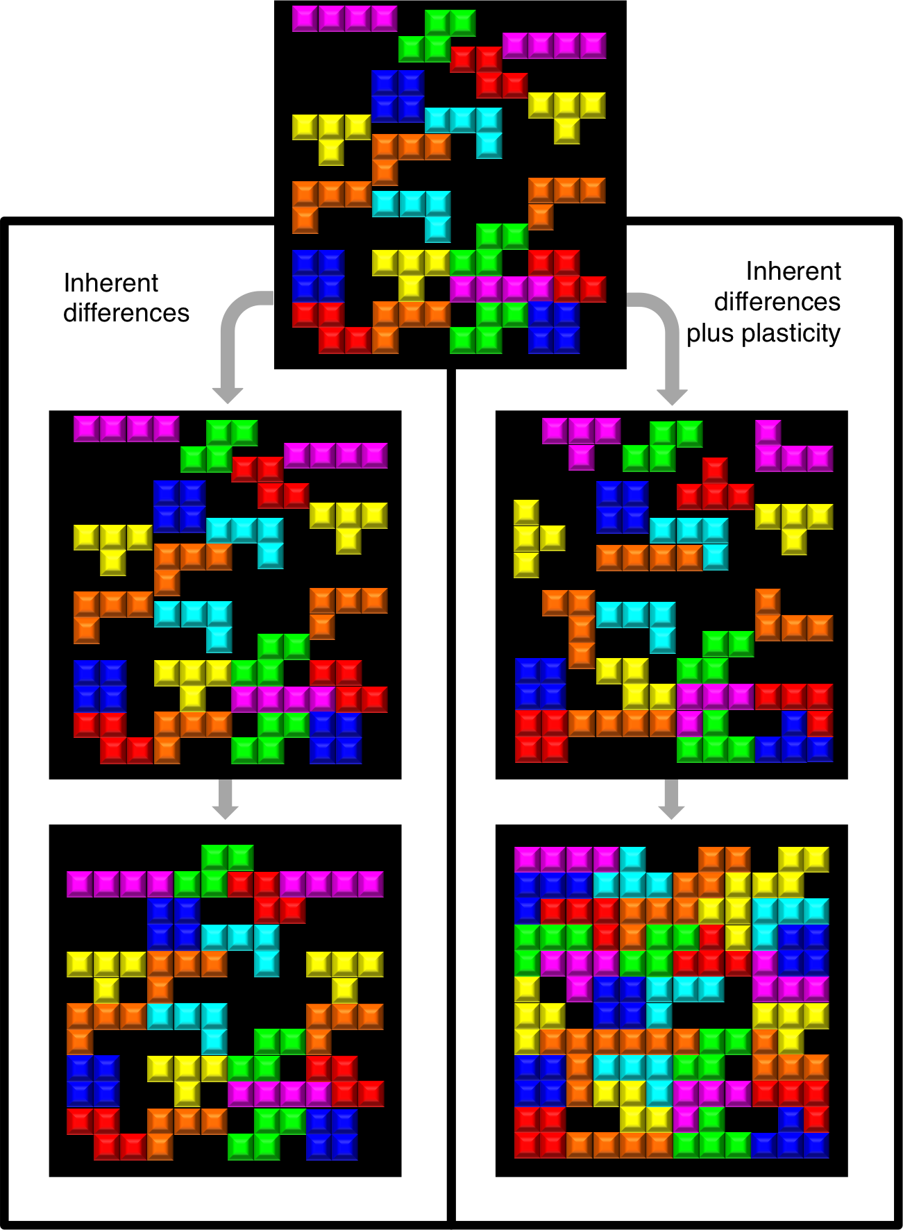 The central idea may be visualised as a game of Tetris. Niche complementarity is a widely accepted hypothesis for how diversity may enhance productivity. The traits (shape) of species (coloured pieces) influence their complementarity (how well they fit together) and thus their combined ability to exploit resources and grow (fill space). If individuals can be plastic – that is, shift their traits (shape) in response to their neighbours – this could, in theory, also affect their complementarity.