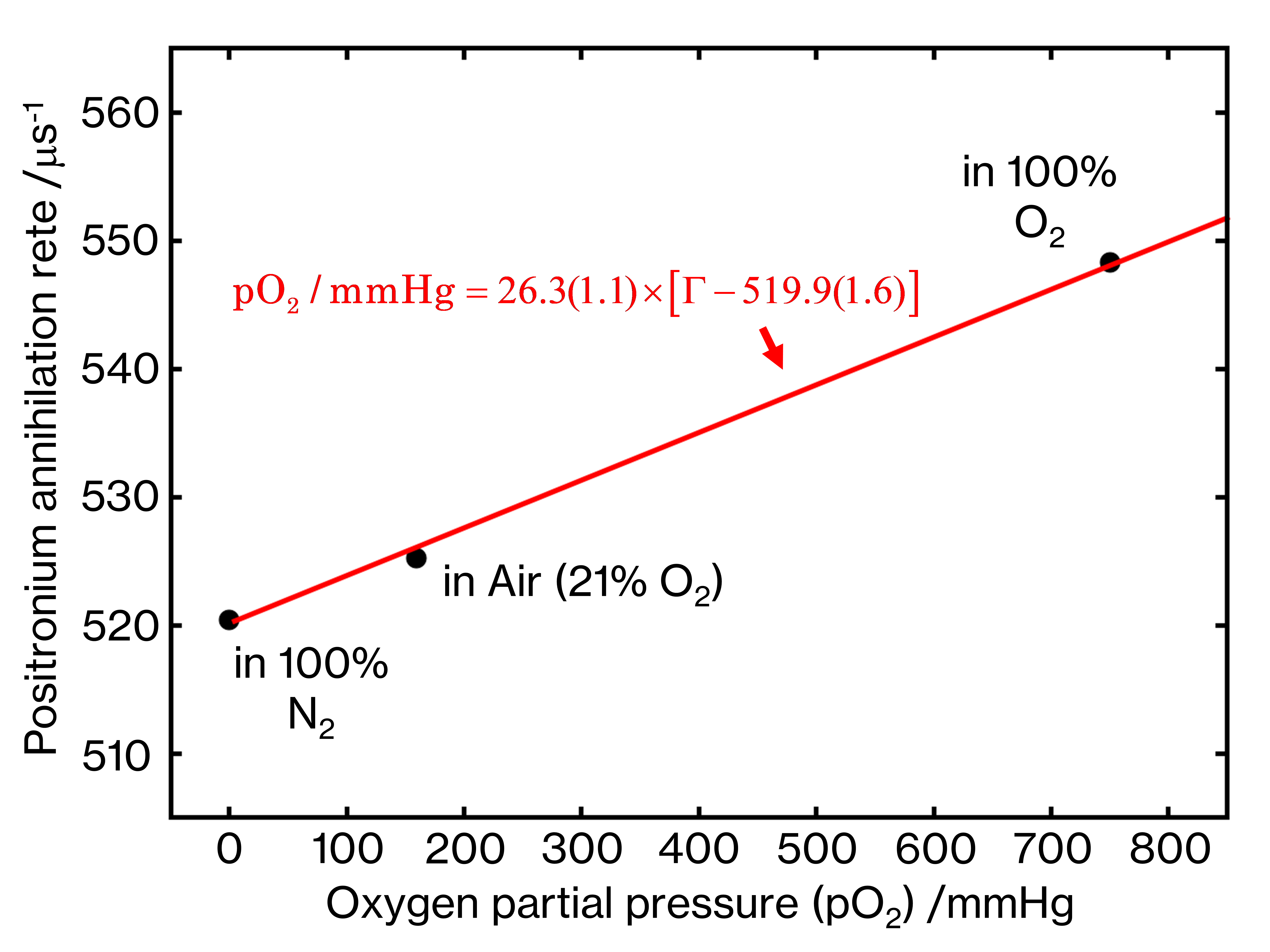 Figure: The relation between pO2/mmHg and Ps annihilation rate (Γ/μs-1), which is the inverse of the lifetime. The parentheses in the equation indicate the uncertainty (1σ).