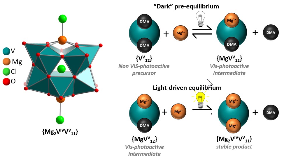 Here, we report a coupled set of light-dependent and light-independent reaction equilibria which control the mono- or di-metal-functionalization of a prototype molecular vanadium oxide cluster. Comprehensive mechanistic analyses show that coordination of a Mg2+ ion to the species {(NMe2H2)2[VV12O32Cl]}3- results in formation of the mono-functionalized {(NMe2H2)[(MgCl)VV12O32Cl]}3- with simultaneous release of a NMe2H2+ cation. Irradiation of this species with visible light results in one-electron reduction of the cluster shell, exchange of the second NMe2H2+ with Mg2+, and formation / crystallization of the di-metal-functionalized [(MgCl)2VIVVV11O32Cl]4-. Mechanistic studies show how stimuli such as light or competing cations affect the coupled equilibria. Transfer of this synthetic concept to other metal cations is also demonstrated, highlighting the versatility of the approach.
