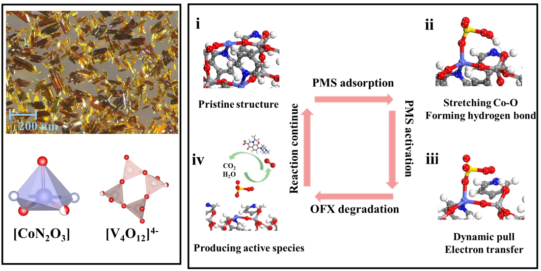 Figure: The optical microscope image of Co2(V4O12)(bpy)2 and coordination modes of Co, V (left). Stepwise analyses of PMS activation mechanism during Fenton-like reaction (right). Image author: Prof. Dr. Chong-Chen Wang