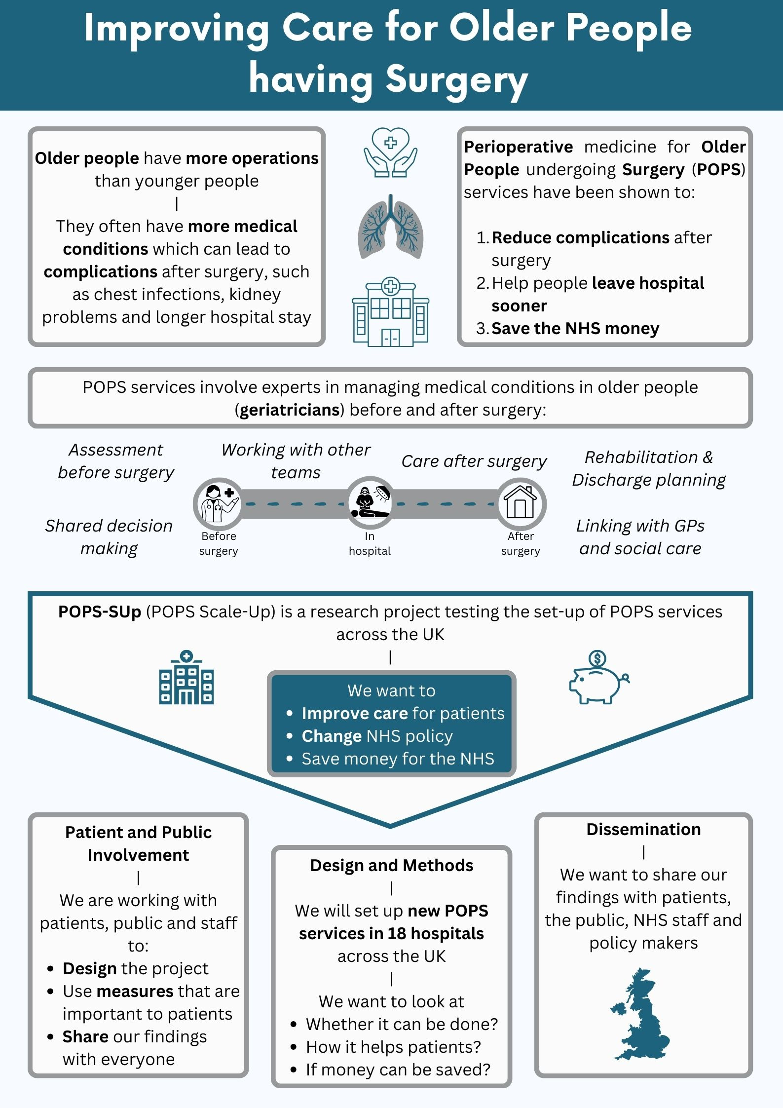 POPS was first set up at one NHS hospital, together with patients, carers, surgeons, anaesthetists, nurses, therapists and managers. The service has been shown to reduce complications after surgery, help people leave the hospital sooner and save the NHS money.