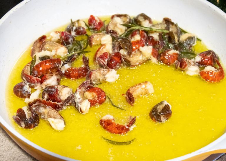 Marbled crayfish tails with herbs, fried in butter. Picture by Sina Tönges.