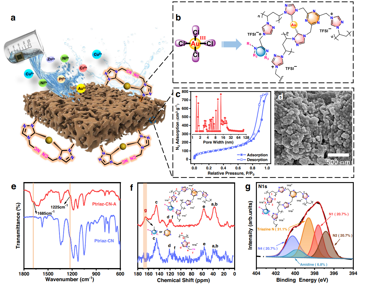 Typically, the cation-methylene-nitrile functionality sequence in the repeating unit of this poly(ionic liquid), in which the pendent nitrile (-CN) groups could undergo coupling reactions; this reaction was catalysed at room temperature by NH35. By taking advantage of an ammonia-catalysed molecular crosslinking mechanism, poly(1,2,4-triazolium)s as polycarbene precursors was used to construct a covalently locked porous polymer. We first chose ‘vigorous stirring’ method, by adding polymer solution dropwise into an excess of ethanol containing 0.5 wt% NH3 under vigorous stirring. Insoluble POPcarbene aggregates formed immediately. However, the resulting materials exhibited a lower specific surface area of only 93 m2 g-1, which was not good for mass transfer in the adsorption process. Because the porosity was determined as it allows high-density packing of carbene units for metal binding, an essential factor governing the gold-capturing efficiency of the adsorbent. In this regard, we have farther improved the preparation process for this POPcarbene adsorbent. By introducing thermally induced phase separation (TIPS) process and supercritical CO2 drying, the resulted materials presented 332 m2g-1, with an adsorption performance for gold up to 2.09 g/g.