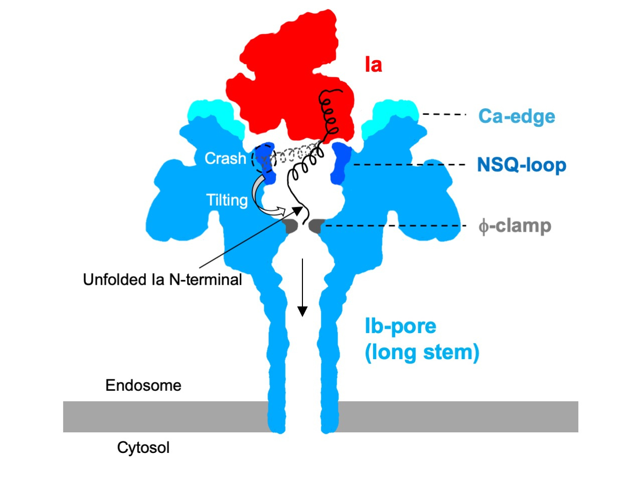 The Ia-bound Ib-pore structure shows that the N-terminal domain of a single Ia molecule binds to the Ib-pore. Notably, the complex structures show that the Ia N-terminus unfolds and leads to the narrowest φ-clamp by binding to the Ib-pore. For the first time, these structures provide valuable insight into how Ia would be translocated via a φ-clamp with an inner diameter of 6 Å. Compared to the LF-bound PA-pore model, the complex structure of the Ia-bound Ib-pore showed a unique binding mode and unfolding and translocation mechanisms even though they use similar translocation pores.