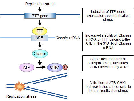 Many genes associated with the initiation and development of tumors are regulated at the level of mRNA stability. Tristetraprolin (TTP, encoded by the ZFP36 gene) belongs to RNA binding protein family that can physically interact with a cis-acting adenosine-and-uridine–rich element (ARE) within the 3′-untranslated region (3′UTR) of its target mRNA. TTP then normally promotes the decay of these mRNAs by recruiting exosome complex for rapid shortening of the poly(A) tail but to fewer occasions, it may also increase the stability and translation of target mRNAs. As a member of the family of immediate-early response genes, TTP is induced by various stimuli such as insulin, serum, or a mitogen in quiescent fibroblasts. Recent studies also indicate that TTP is rapidly induced in response to a DNA damaging agent doxorubicin in a p53-dependent manner. As a research group interested in the regulatory mechanism of DNA damage response, these reports prompted us to explore the unprecedented roles of TTP during the DNA damage response. In this study, however, we were not aimed to uncover the mechanistic aspects of TTP gene induction by DNA damage, instead, we focused to unveil a novel function of TTP during replication stress response (RSR). Replication stress triggers the activation of a signaling cascade mediated primarily by the ATR-CHK1 pathway that promotes resolution of the stress and resumption of replication fork progression, collectively known as the S phase checkpoint.