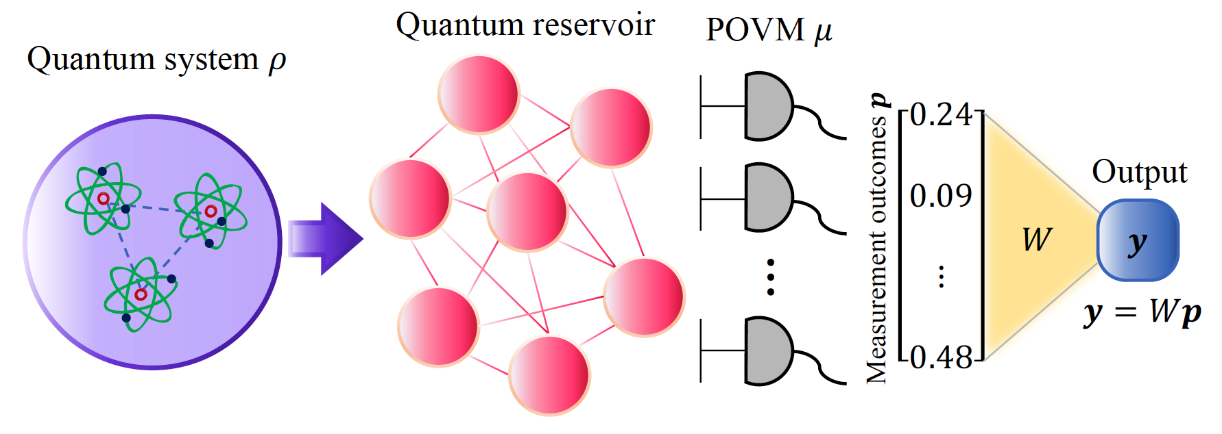 Quantum ELM The most straightforward way to define a “quantum ELM (QELM)” is to replace the reservoir mapping with some kind of quantum dynamics, the input data vectors with quantum states, and then apply the final linear transformation on the measurement probabilities obtained upon measuring the output states. QELMs have recently garnered attention due to their potential for processing classical and quantum information.