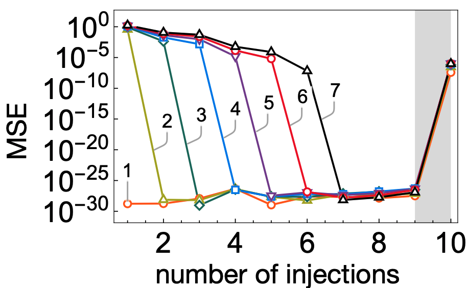 Figure 5: Reconstruction error (MSE) vs number of injections for polynomial target functionals with k=1,…,7 and for a reservoir of 8 qubits.