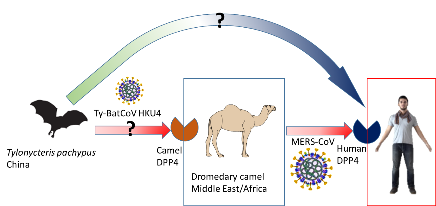 Coronaviruses (CoVs) are a significant threat to human health, reflected by the emergence of the severe acute respiratory syndrome (SARS) and Middle East Respiratory syndrome (MERS) epidemics within a decade. Recently, SARS-CoV-2 has emerged to cause the much more disastrous COVID-19 pandemic, affecting millions of people around the world. Bats are major reservoirs of diverse CoVs and believed to be the primary origin of these epidemics. MERS-CoV infections have been reported in 27 countries with a total of 2562 laboratory-confirmed cases and 881 deaths up till now, with a fatality rate over 30%. Dromedary camels in Africa and the Middle East are infected by MERS-CoV and believed to be the immediate source of many human cases. MERS-CoV was postulated to have originated from bats and subsequently jumped to camels and humans. But then what is the evolutionary pathway and how may the viral ancestor cross the species barrier to cause the emergence of MERS-CoV?