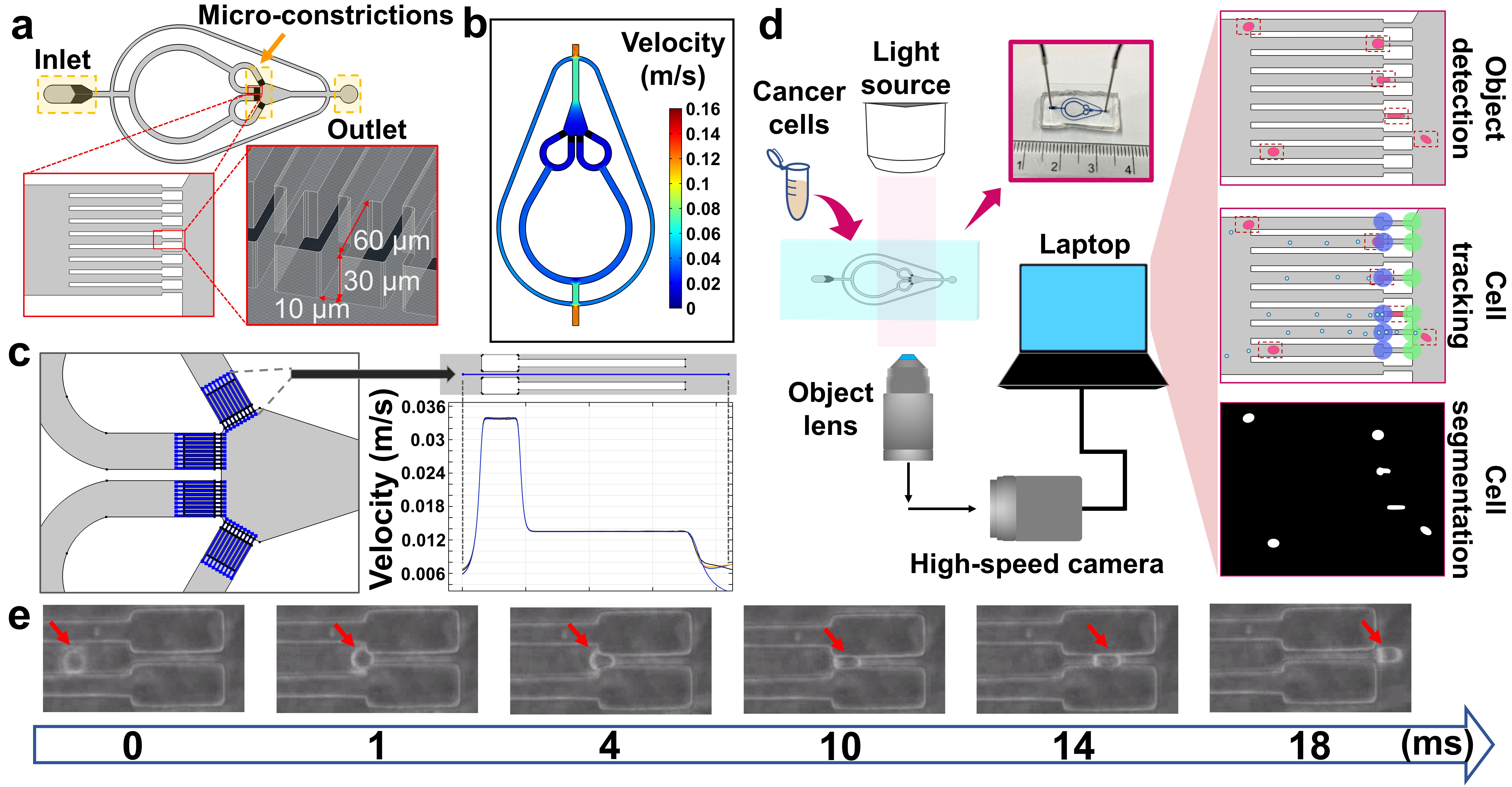 Fig 1 Design of the Constriction-based deformability cytometry (cDC) platform. a) Schematic diagram of the microfluidic device. b) Top view of laminar flow velocity simulation of the microfluidic chip. c) Fluid flow velocity across 36 microconstrictions. d) Schematic view of the cDC platform's experimental setup and computational framework. e) Time-lapse imaging showing cell deformation and movement through a microconstriction.