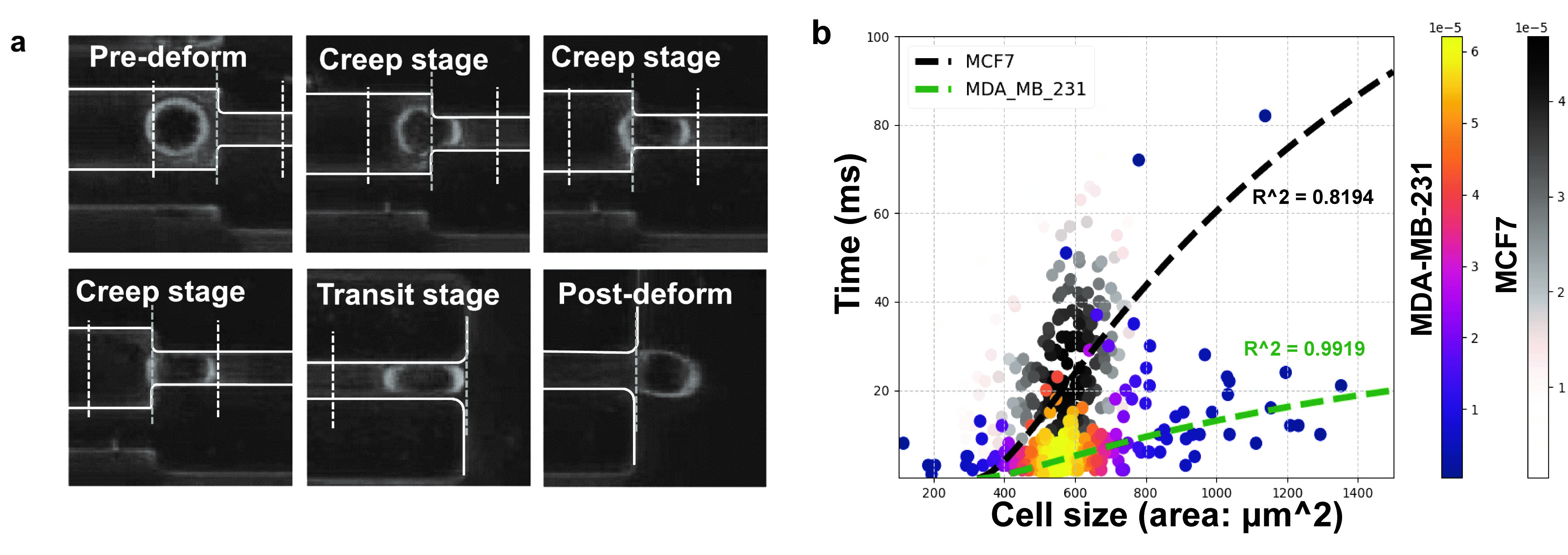 Figure 2. Cell Behavior Analysis: a) Deformation of cells after entering the microconstriction. b) Plot of creeping time and cell size of MCF7 and MDA-MB-231 cells. Data points representing MCF7 and MDA-MB-231 were displayed in different colors.