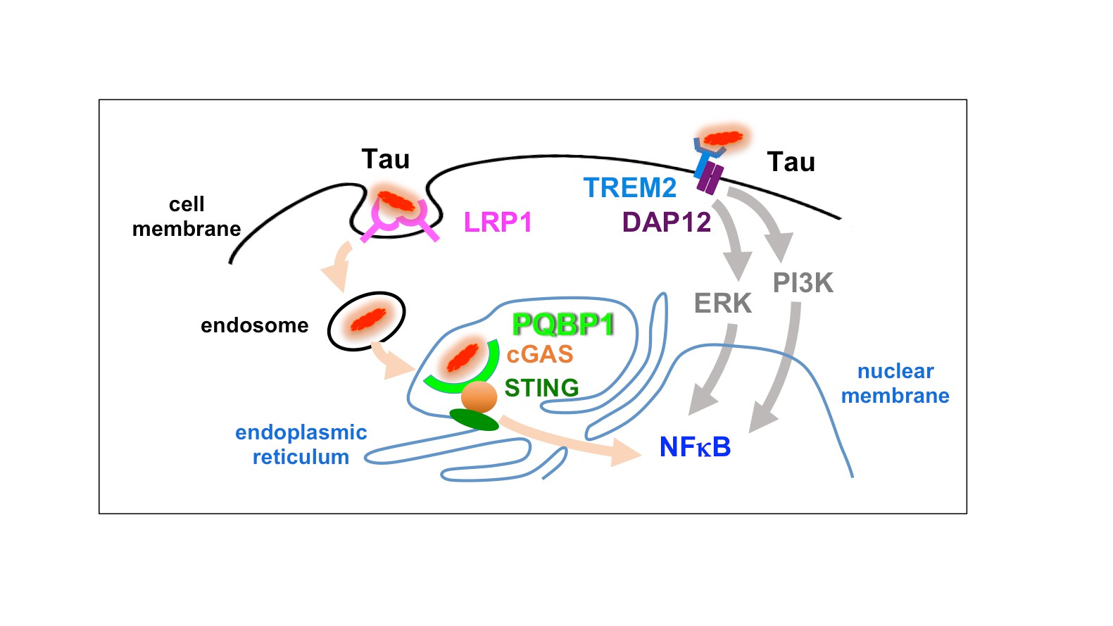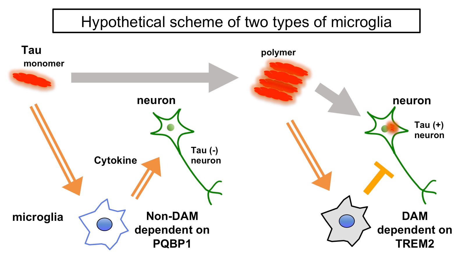 Knowledge of the interaction of PQBP1 with multiple neurodegenerative disease proteins and of the intracellular receptor function of PQBP1 in dendritic cells15 stimulated our imagination that PQBP1 might function in microglia, the dendritic cell in the brain, to sense neurodegenerative disease proteins. Our intensive analyses to examine this hypothesis supported that PQBP1 senses Tau 3R/4R proteins, especially their non-aggregated forms, as an exogenous pathogen to trigger brain inflammation (Figure 1)16.