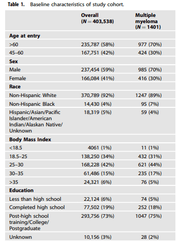 Despite patient interest in knowing whether diet is linked to multiple myeloma (MM), there is limited research on dietary patterns and MM risk [1]. Two studies have assessed this risk, albeit with a small number of MM cases. The EPIC-Oxford cohort and Oxford Vegetarian study (65 MM cases) showed that fish eaters, vegetarians and vegans had significantly reduced MM risk compared to meat eaters (RR 0.23, 95% CI, 0.09-0.59) [2]. The Nurses' Health Study and Health Professionals Follow-up Study (478 MM cases) showed a significantly increased MM risk in men with Empirical Dietary Inflammatory Pattern (HR 1.16, 95% CI, 0.96-1.24) [3]. Therefore, we evaluated the association between pre-diagnosis dietary patterns and MM risk in the NIH-AARP Diet and Health Study.