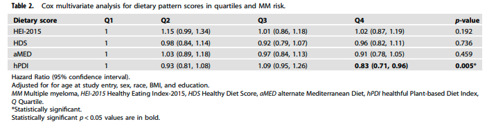 A healthful plant-based diet was associated with reduced MM risk in the NIH-AARP cohort. Our findings confirm the observations from the EPIC-Oxford and Oxford-Vegetarian study. These results will help oncologists and patients make informed choices about their diet. To our knowledge, this is the largest epidemiologic study to date assessing pre-diagnosis dietary patterns and MM risk with 1,401 MM cases. Larger randomized clinical trials are needed to better understand this potential association and its underlying mechanisms. Preliminary results of a pilot nutrition-based intervention study (NUTRIVENTION) in individuals with precursor plasma cell disorders and BMI ≥25 (NCT04920084) show that a high-fiber plant-based diet is feasible and leads to improvement in biomarkers associated with progression to MM such as insulin resistance and gut microbiome diversity and composition and reduction in progression trajectory in 2 patients [5]. A larger randomized plant-based dietary study (NUTRIVENTION-3) is currently enrolling (NCT05640843) [6].