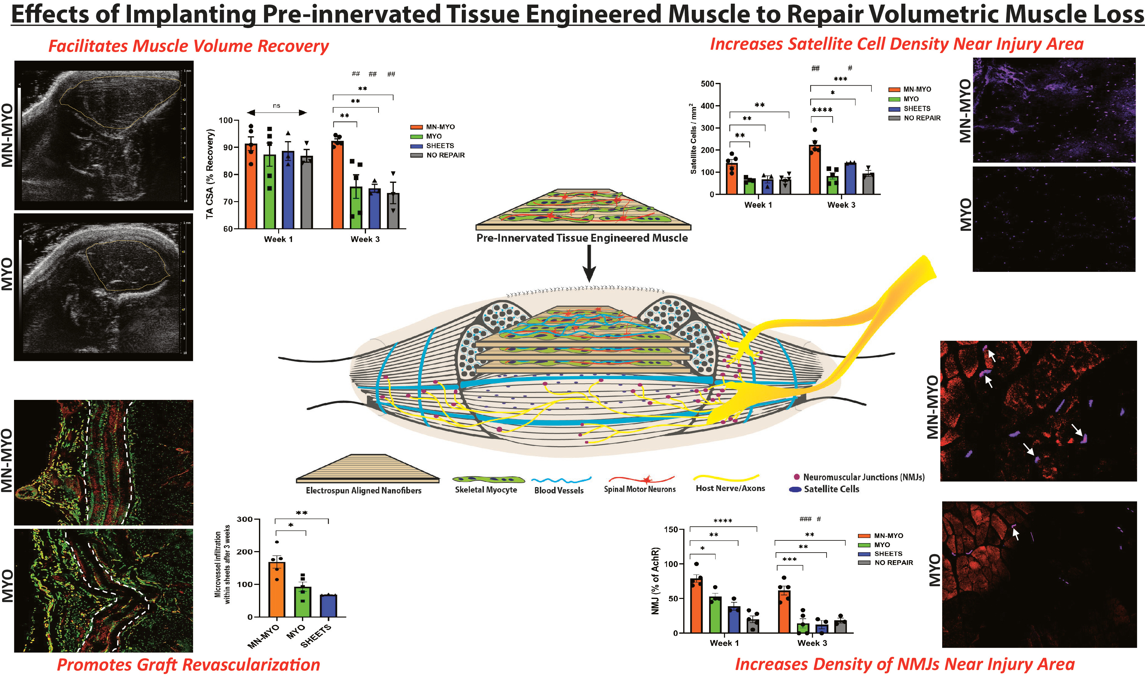 Immunohistochemical analysis of the graft area as well as remaining host muscle was performed through extensive confocal imaging. Our implanted cells survived for at least 3-weeks and we observed that pre-innervated bioscaffolds significantly increased the density of muscle stem cells or satellite cells near the injury site. Satellite cells play a key role in myogenesis and the fact that pre-innervation augmented their proliferation is very exciting. Graft revascularization is another critical part of survival and integration of tissue engineered implants. Although at the 1-week time point there was no endothelial cell migration within the implanted sheets, we observed significant revascularization within pre-innervated bioscaffolds by 3-weeks. Next, we assessed the co-labeling of nicotinic Acetylcholine Receptors (nAchRs) – forming pretzel-shaped clusters to constitute motor end plates – with a presynaptic marker to identify the points of innervation on the muscle, referred to as Neuromuscular Junctions (NMJs). We found that the pre-innervated group had the most NMJs as compared to other groups at both 1- and 3-weeks after VML repair.