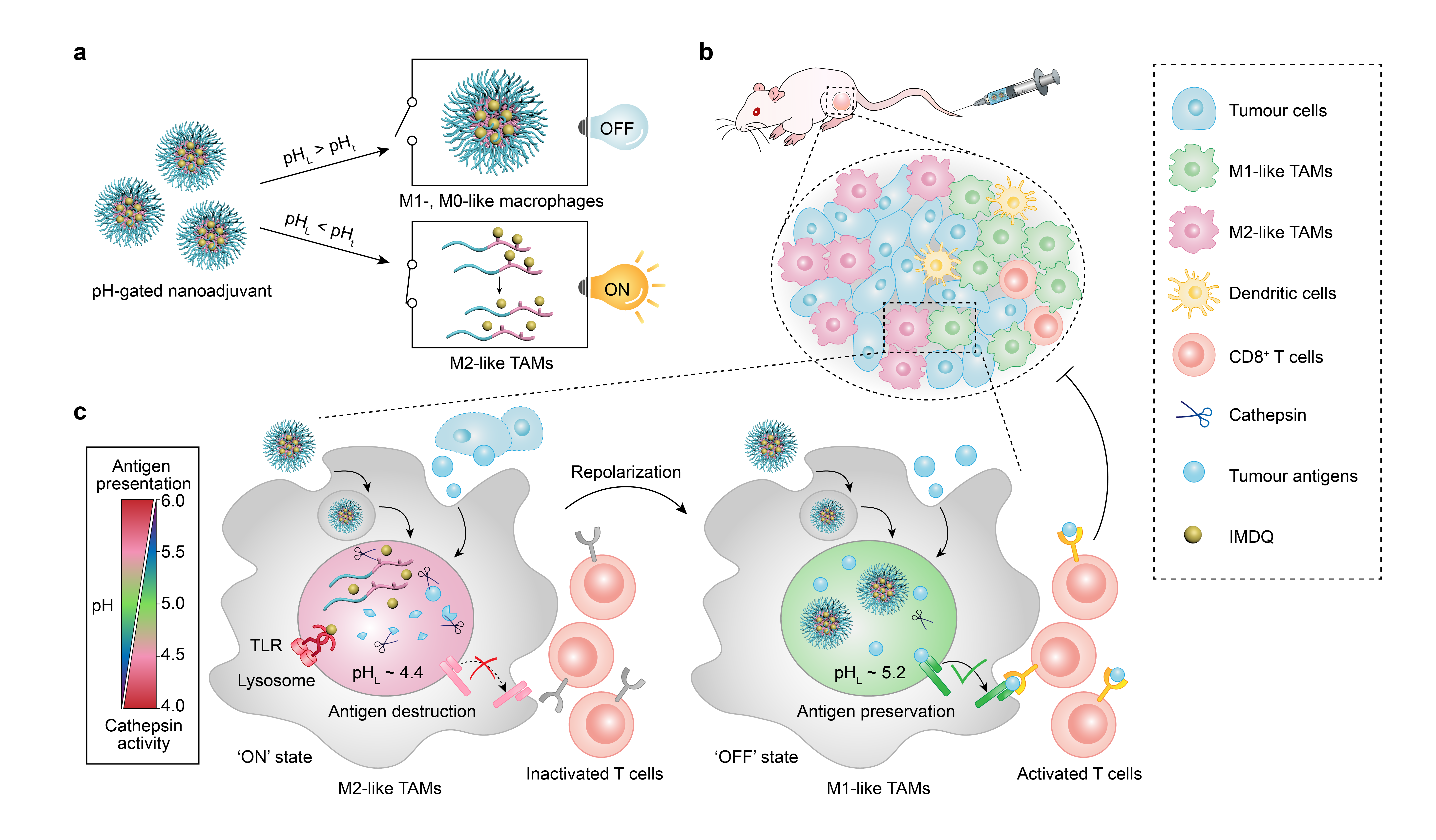 However, the story of M2-like macrophage-targeted strategy is far from over. We further designed the PGN4.9 nanoadjuvant which renders AND-gated behaviour that converts two orthogonal inputs (i.e., pH and cathepsin activity) into IMDQ release as a single output. The pHt tunability facilitates the successful screening of PGN4.9 nanoadjuvant for the specific targeting of lysosomal pH of M2-like TAMs, followed by enzymatic cleavage-mediated drug release to achieve logic-gated immunotherapies. PGN4.9 nanoadjuvant efficiently tunes down lysosome acidification and proteolysis of M2-like TAMs, thereby dramatically potentiates antigen cross-presentation, and activates CD8+ T cell function to elicit adaptive tumour immunity in various tumour models. In contrast, PGN4.9 nanoadjuvant keeps inert in other cell types and circumvents acute systemic toxicity for cancer immunotherapy.