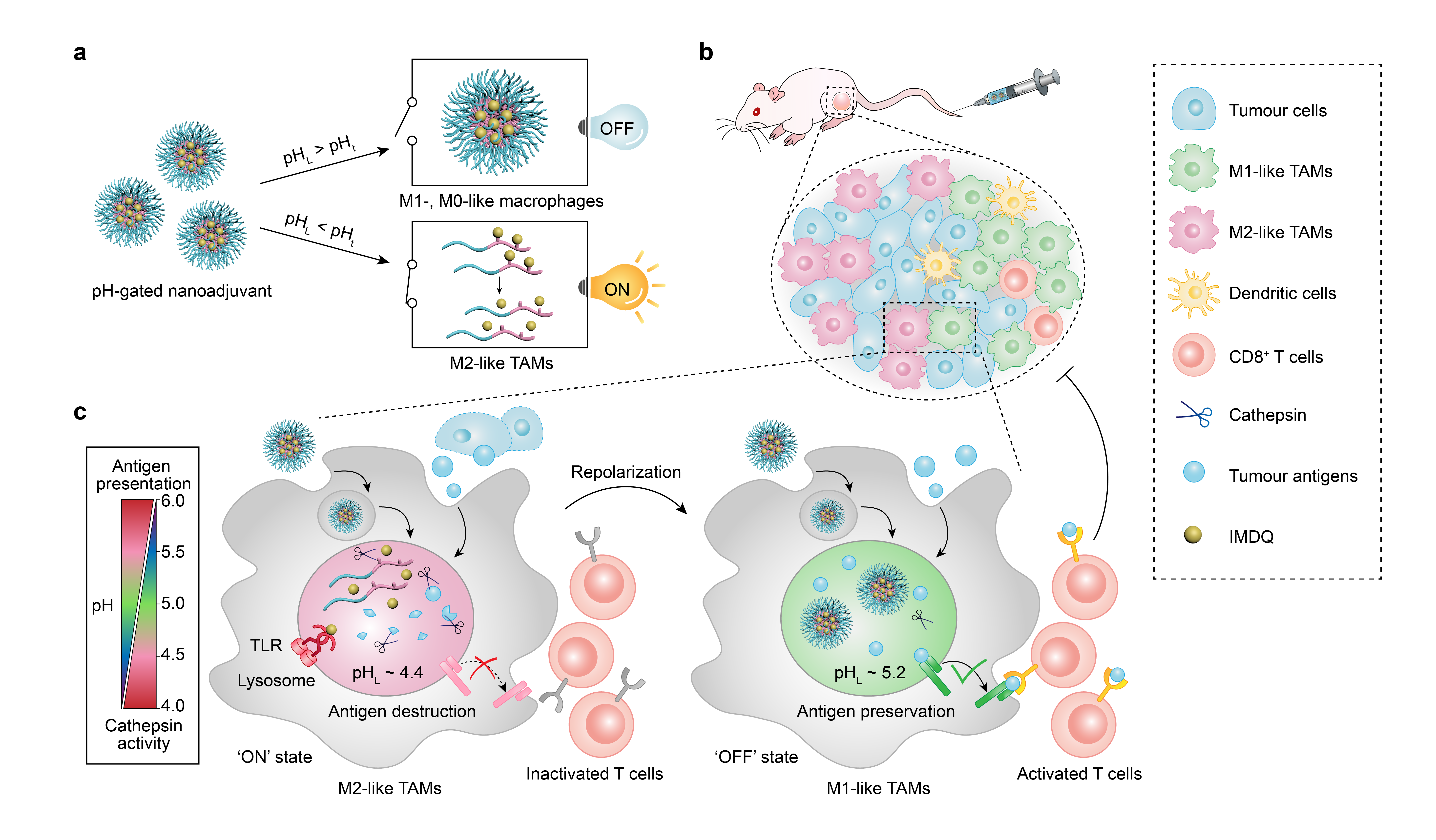 However, the story of M2-like macrophage-targeted strategy is far from over. We further designed the PGN4.9 nanoadjuvant which renders AND-gated behaviour that converts two orthogonal inputs (i.e., pH and cathepsin activity) into IMDQ release as a single output. The pHt tunability facilitates the successful screening of PGN4.9 nanoadjuvant for the specific targeting of lysosomal pH of M2-like TAMs, followed by enzymatic cleavage-mediated drug release to achieve logic-gated immunotherapies. PGN4.9 nanoadjuvant efficiently tunes down lysosome acidification and proteolysis of M2-like TAMs, thereby dramatically potentiates antigen cross-presentation, and activates CD8+ T cell function to elicit adaptive tumour immunity in various tumour models. In contrast, PGN4.9 nanoadjuvant keeps inert in other cell types and circumvents acute systemic toxicity for cancer immunotherapy.