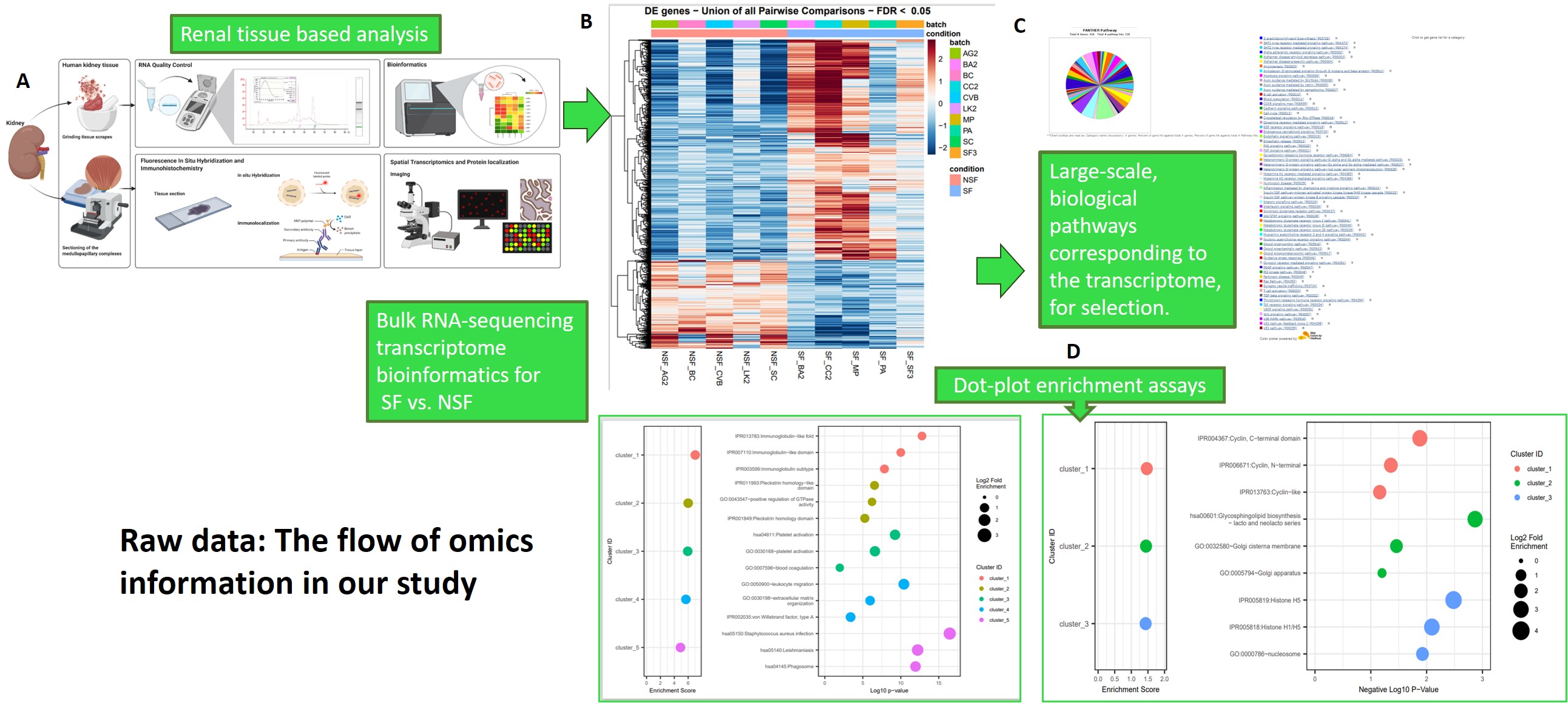 Figure 7: Raw study design: the flow of omics information in our study. A) Renal tissue-based analysis methods for bulk-RNA sequencing and fluorescence in situ hybridization to obtain B) heatmaps and spatial transcriptomics data (the latter is discussed later), C) using the bioinformatics data we then determined selective biological pathways corresponding to transcriptome data via databases (seen as a colour wheel) D) dot-plot enrichment assays to visualize the activity of enriched signaling pathways to view genes of interest (phagosomes, immunoglobin-like fold) and interpret the omics data. Image credit: Author’s own.