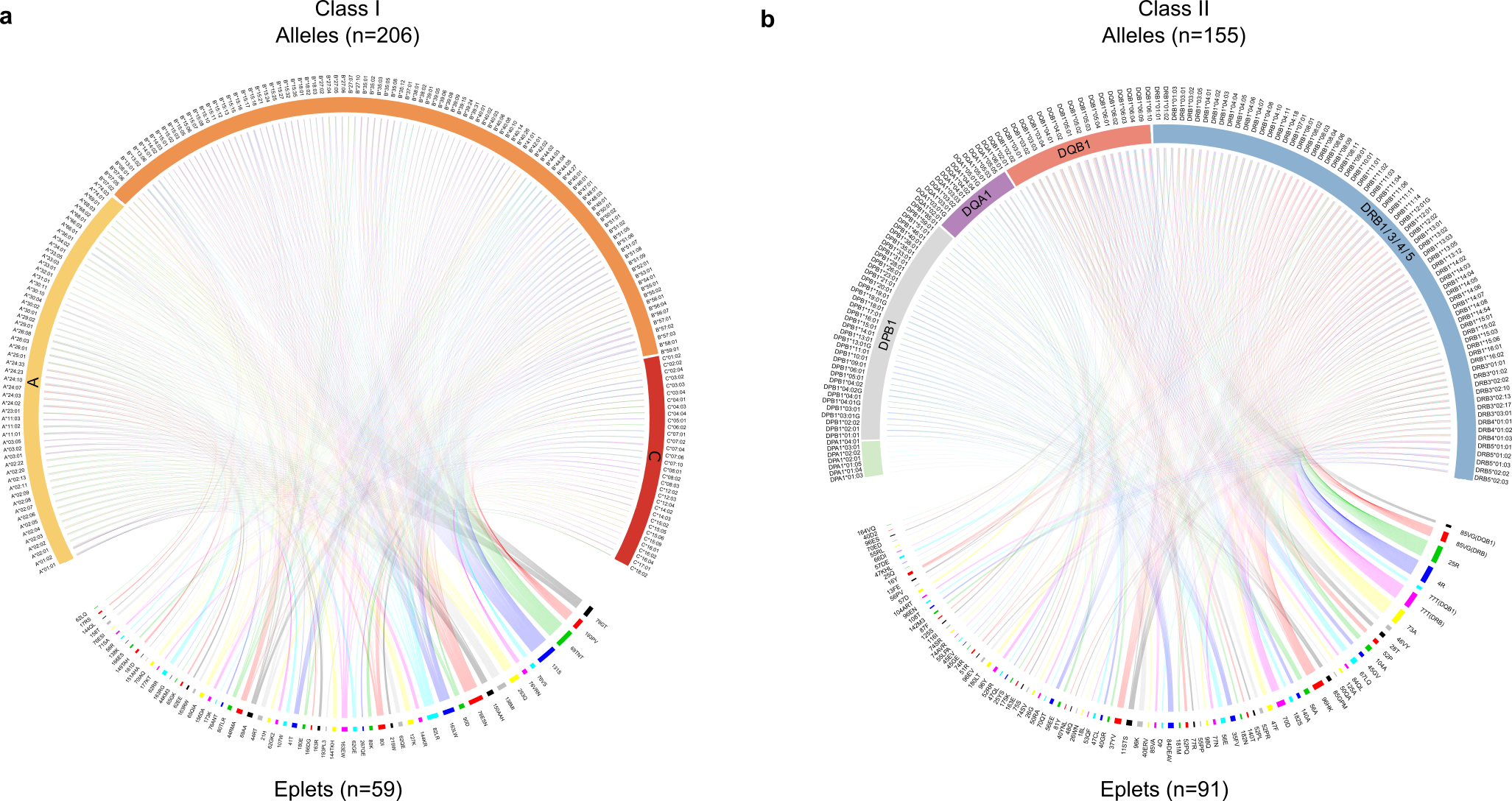 Figure 2. The reduction in HLA complexity when alleles are converted into epitopes. Upper portions of each Circos diagram show the HLA alleles identified in the study transplant population (n=1846), while the lower portions show the translation into the 150 antibody-verified epitopes, simplifying the process for prospective patient and donor matching.